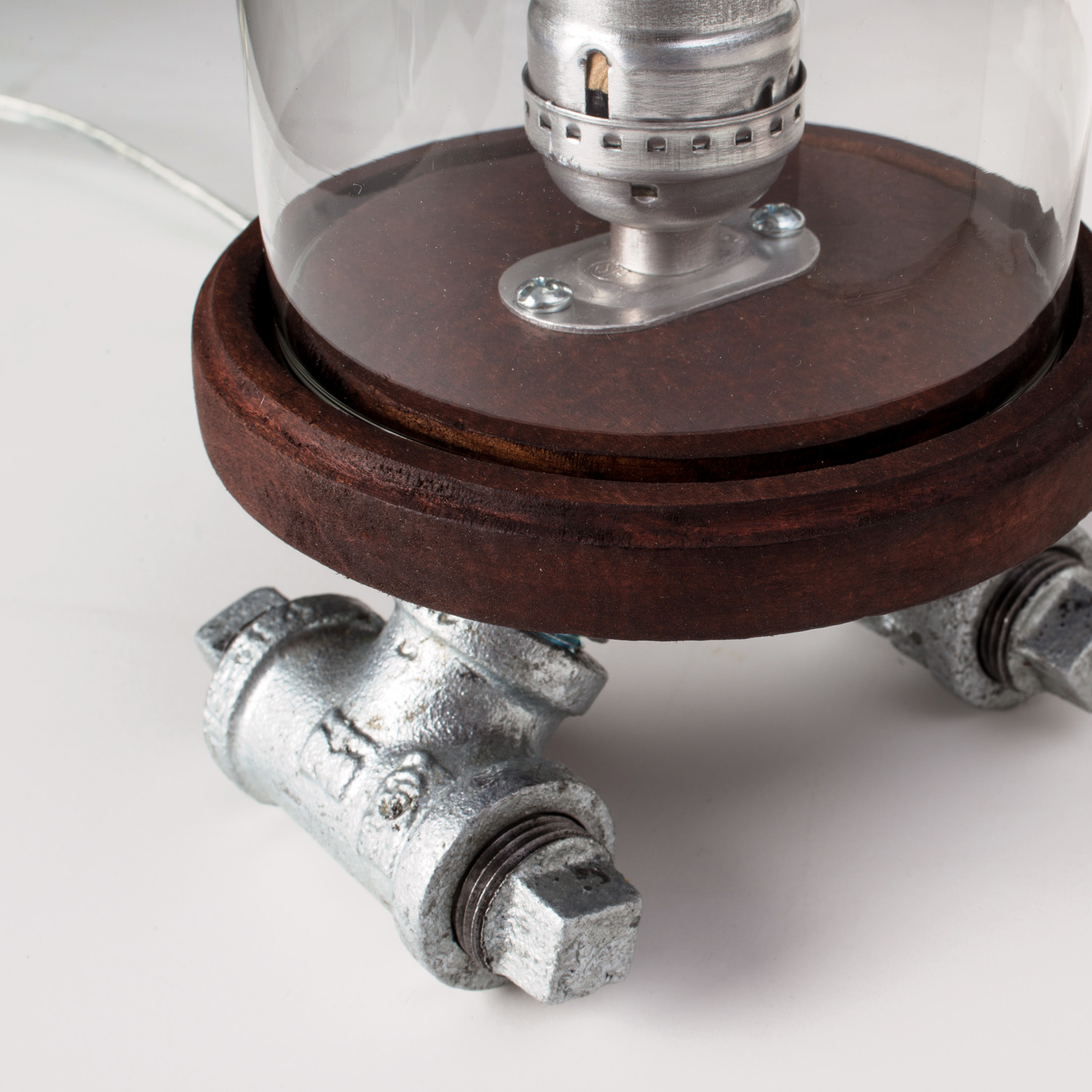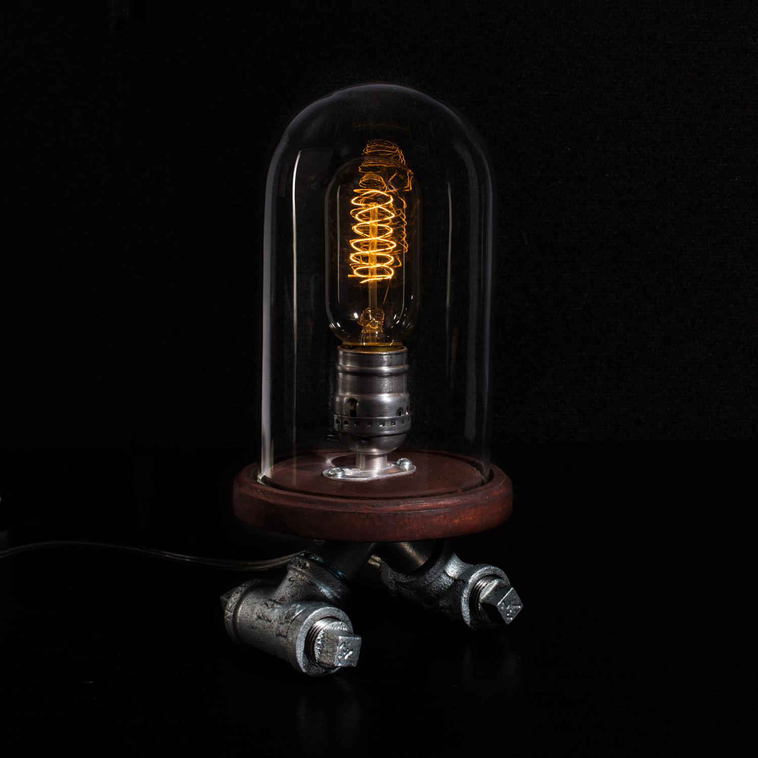 Wood, Steel, Bulb, Bell Jar, Wood Base, Galvanized Steel, Electrical Conduit, Glass Dome, Dimmer Switch