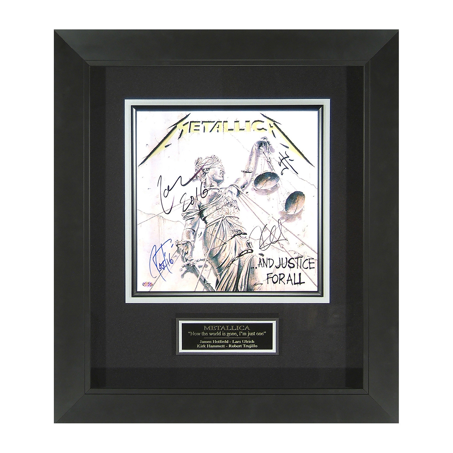 This limited edition music merchandise display is designed to help you preserve pop culture history. Featuring a 12"x12" album flat for the 1988 release of And Justice For All, this collector's item has been autographed by hand in marker by Metallica band members James Hetfield, Kirk Hammett, Robert Trujillo, and Lars Ulrich.