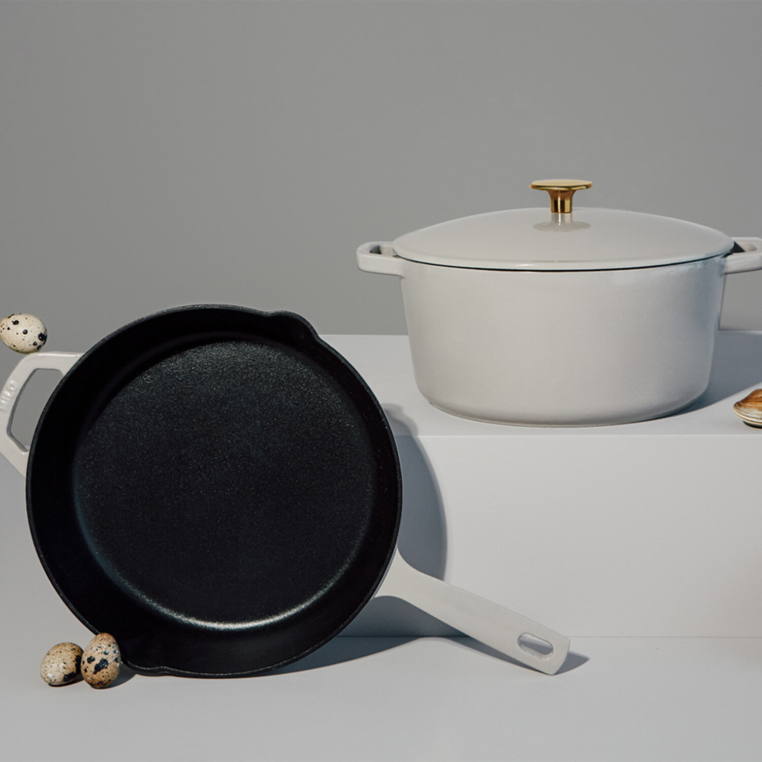 The Classic Dutch Oven is ideal for family-size meals. Use it as a deep fryer, a boil pot, or a casserole dish that effortlessly goes from the stove, to the oven, to the table. The Ultimate Skillet delivers quality heat distribution, even cooking, and durability without the complicated care rituals of raw cast iron. Ready to go out of the box, both are oven-safe to 500℉ , compatible with all stovetops, and even dishwasher friendly!
