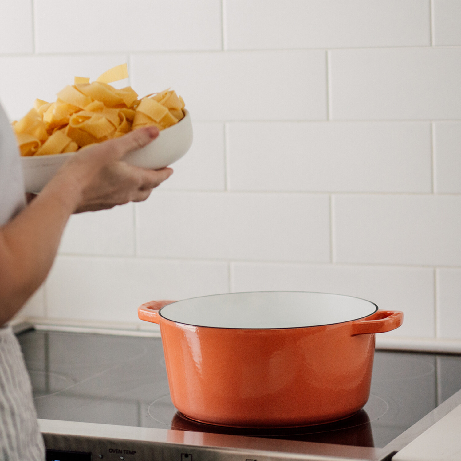 The 5.5 Qt Classic Dutch Oven is a California-designed enameled cast iron Dutch oven that's ideal for family-size meals. Use it as a deep fryer, a boil pot, or a casserole dish that effortlessly goes from stove, to oven, to table. Designed to inspire newcomers and satisfy pros, this enameled cast-iron cookware is non-toxic and dishwasher friendly.