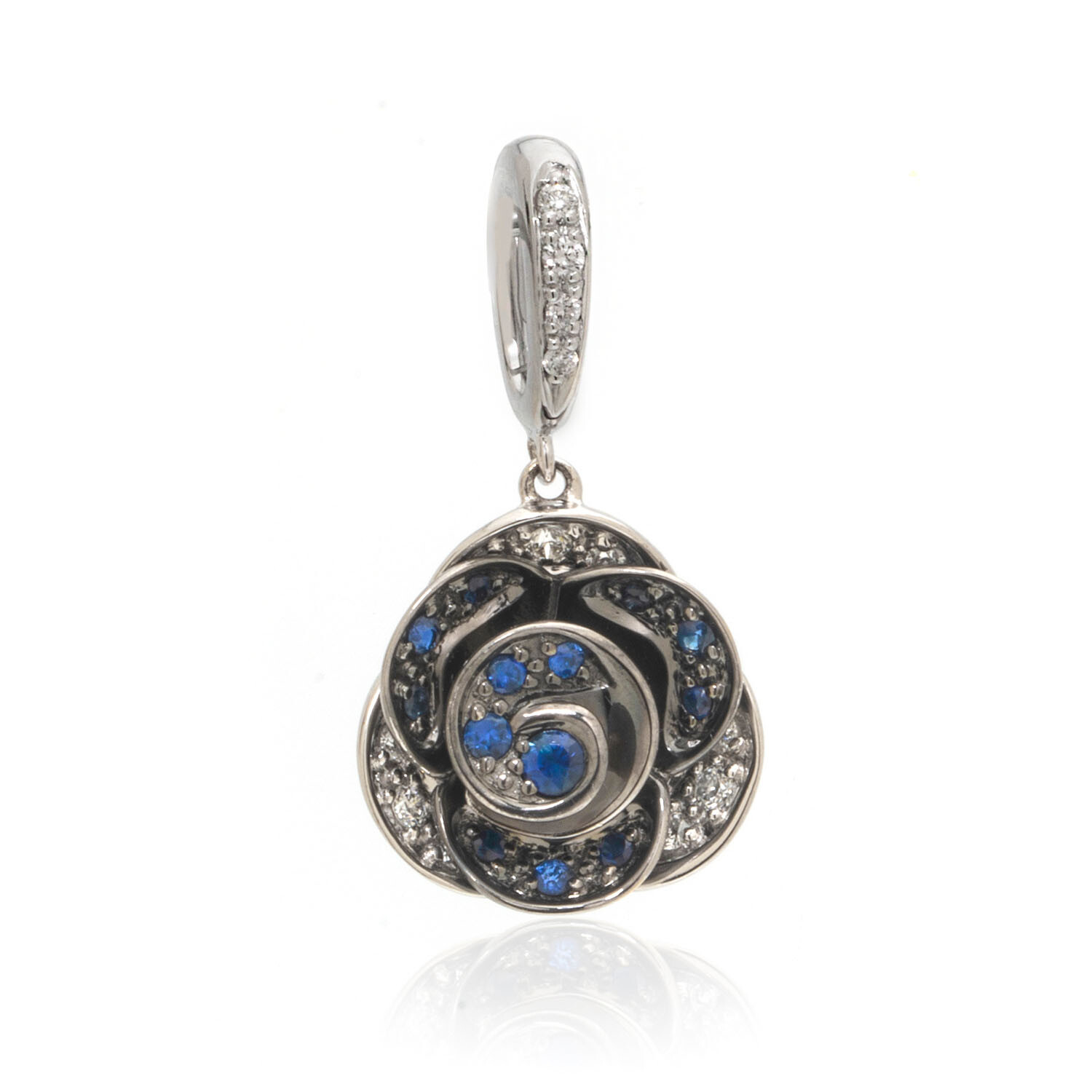 Mimi Milano 18k White Gold Diamond + Sapphire Rose Pendant // Store Display
