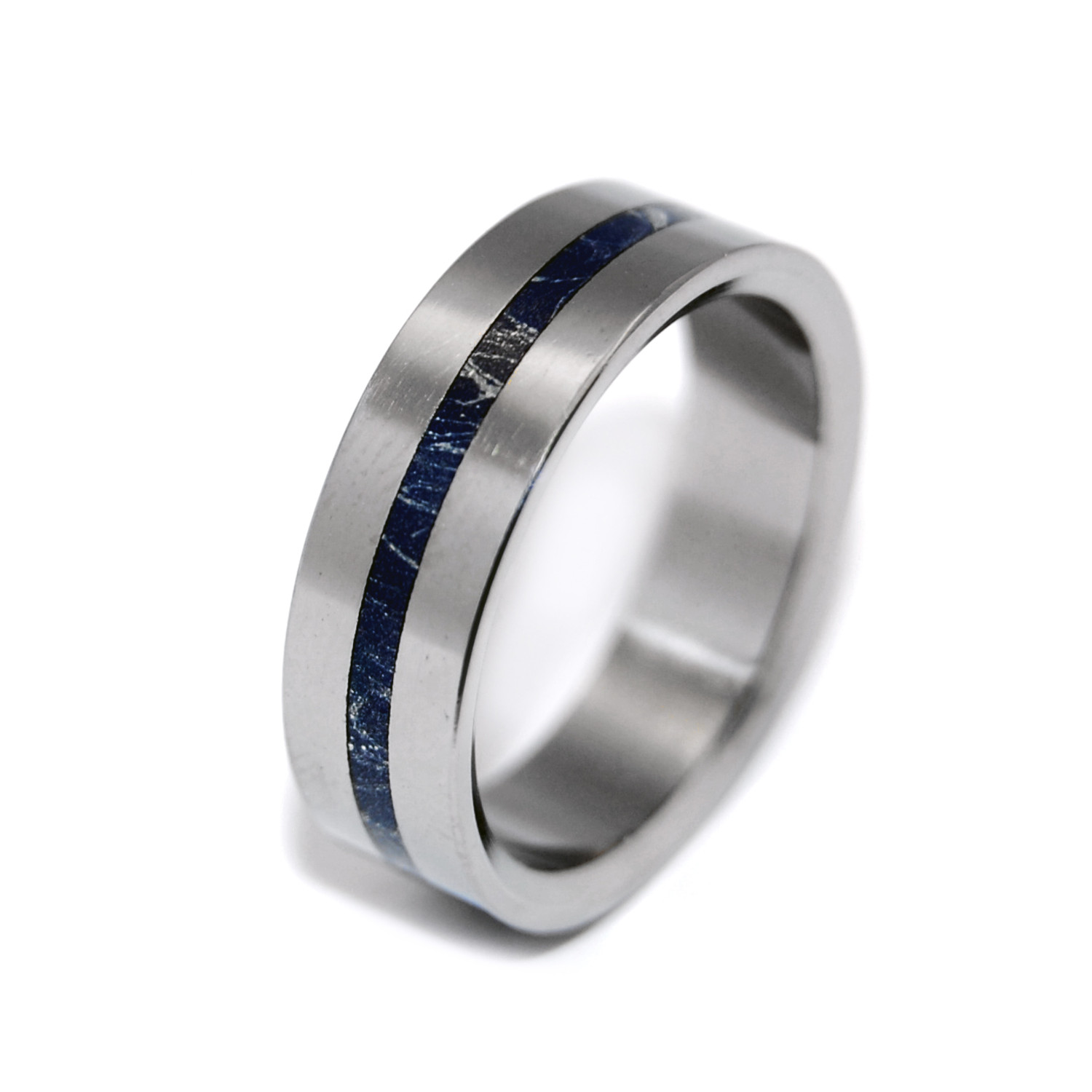 Gorgeous Mokume Gane M3, a Japanese metal, is inlaid with blue bronze and silver in the A Little Of You ring, centered in a beautiful mirror polished titanium band. Each titanium ring is durable and lightweight, and machined to perfection. They are perfect as wedding bands, or just as a reward for your great taste.