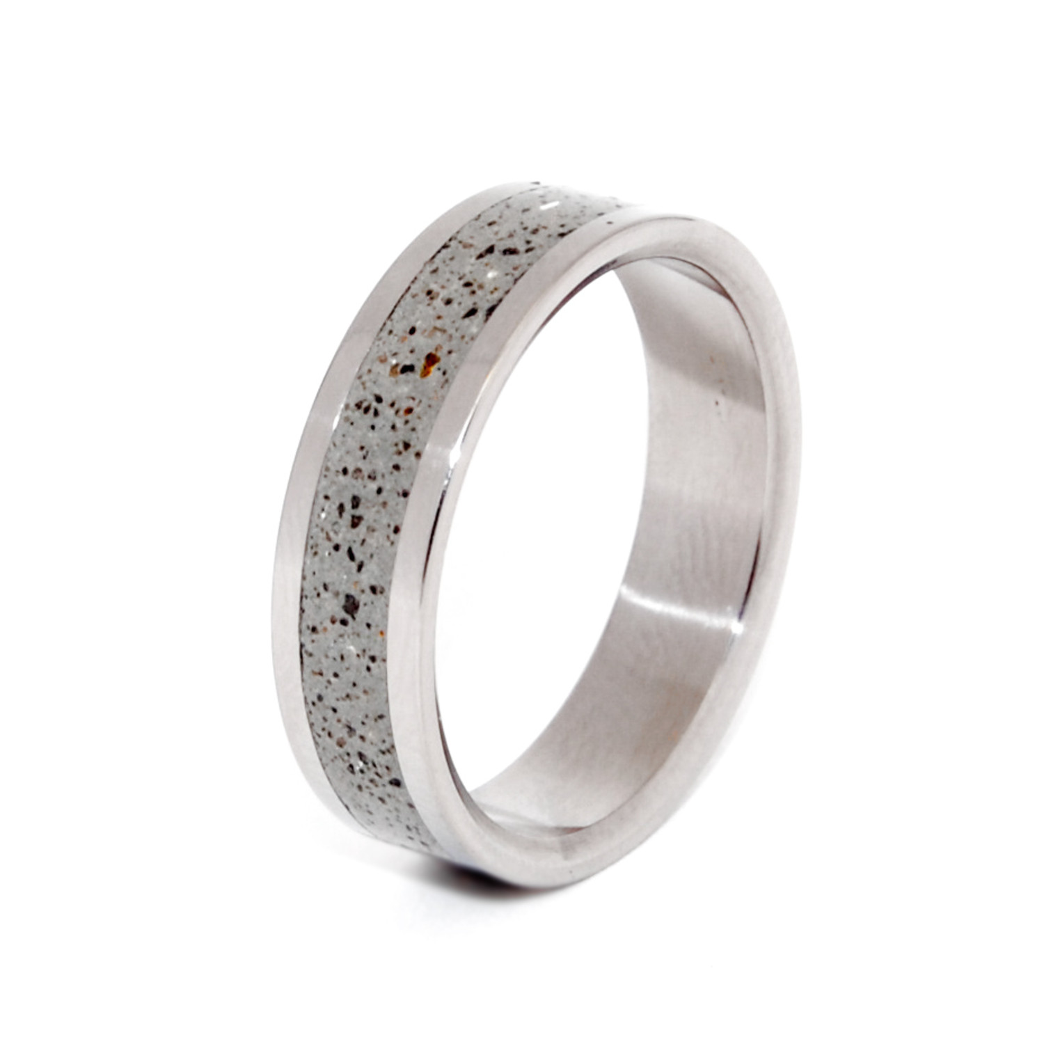 Natural gray concrete has been inlayed in the Sidewalk ring for sleek modern style. This band set is the perfect blend of natural and earthy, with pebbled grain set flush in titanium, and smooth to the touch. Each titanium ring is durable and lightweight, and machined to perfection. They are perfect as wedding bands, or just as a reward for your great taste.