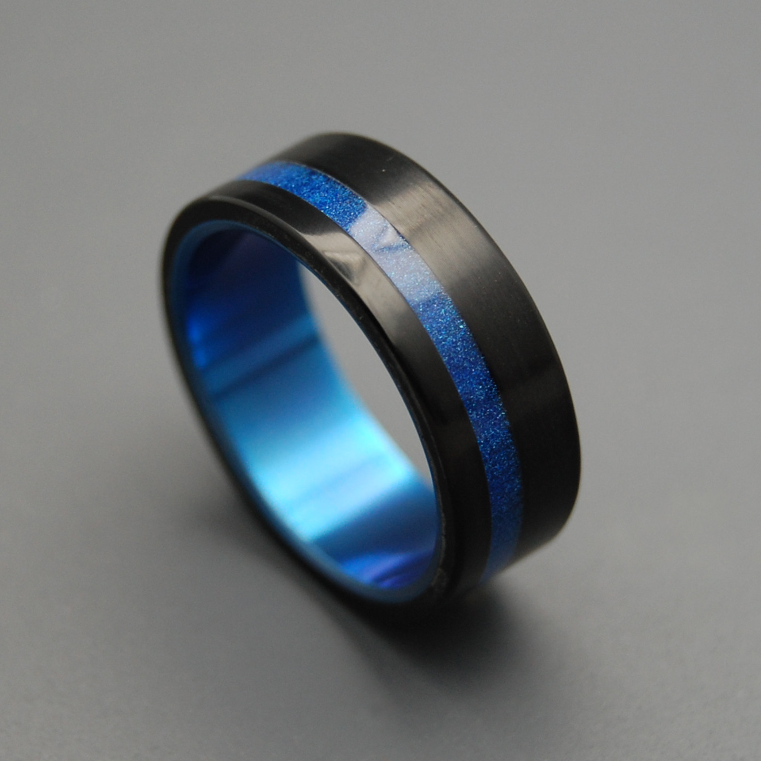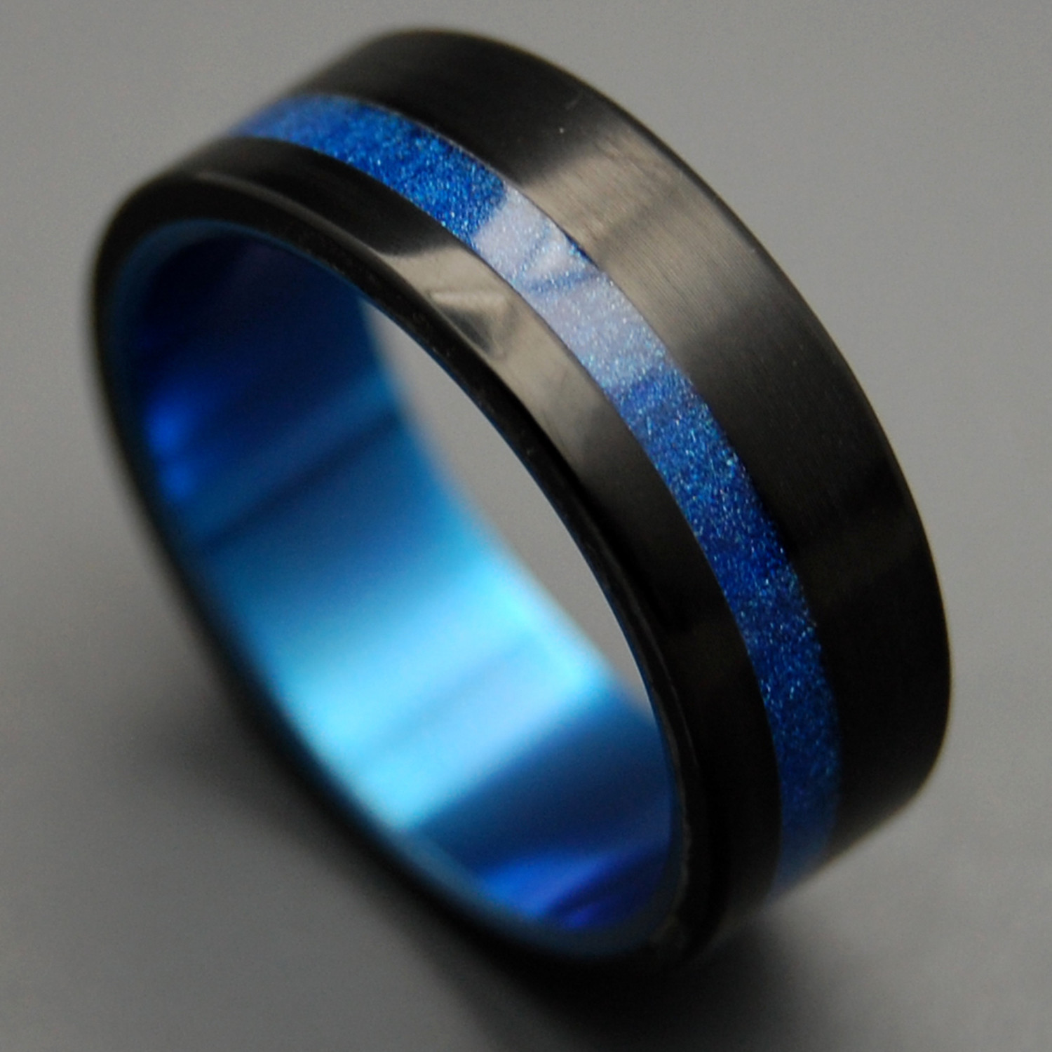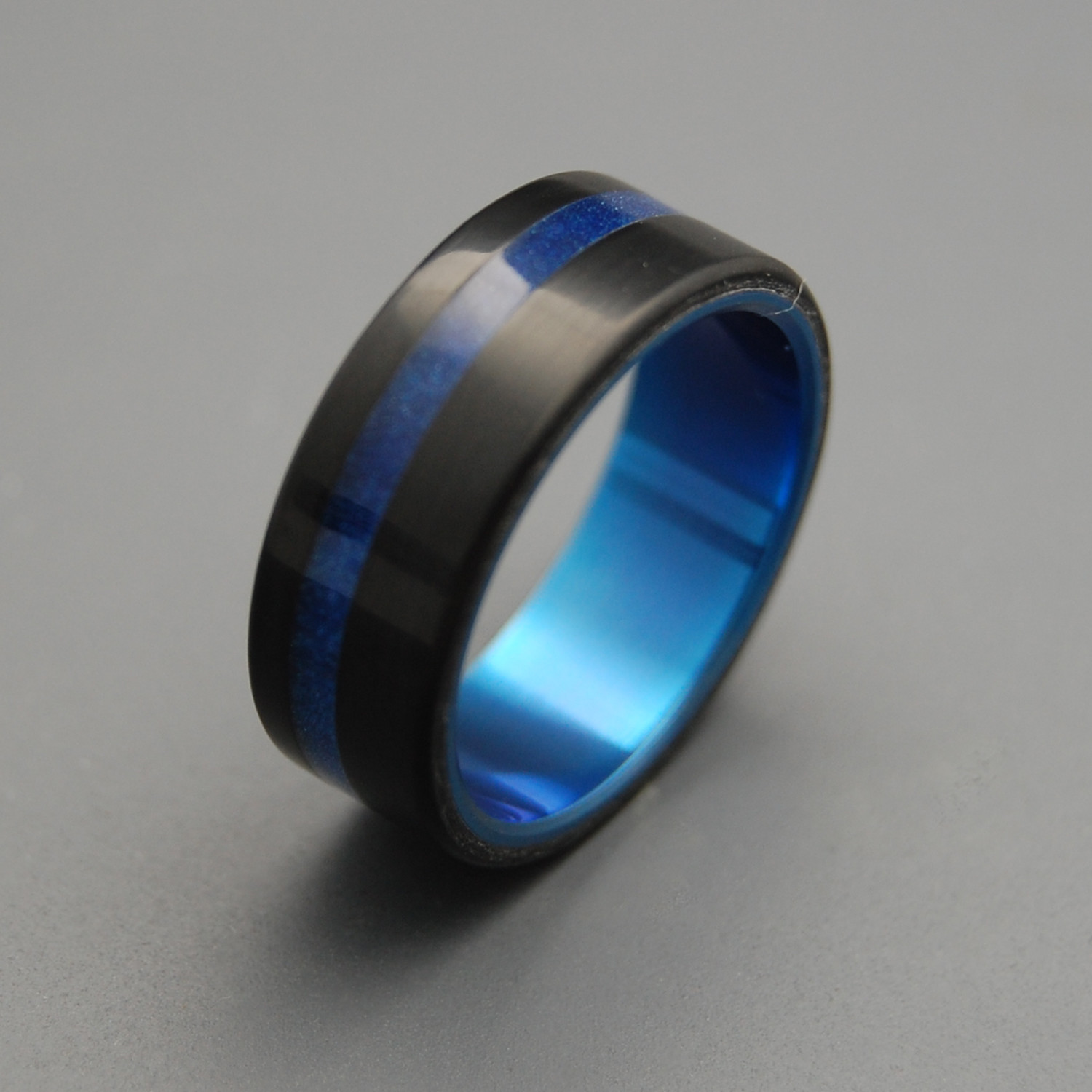Mysterious, bold, and eye catching, this collection of sleek, minimalist rings from Minter & Richter pays homage to the sci-fi mystery thriller, Blade Runner 2049. Inspired by the mood and coloring of this futuristic noir series, Replicant is constructed from pure titanium, overlayed with two types of resin. The solid black-sheen resin is offset by a brilliant Blue Opalescent overlay, and finished with a matching anodized interior that only magnifies the blue depths of this beautiful band.