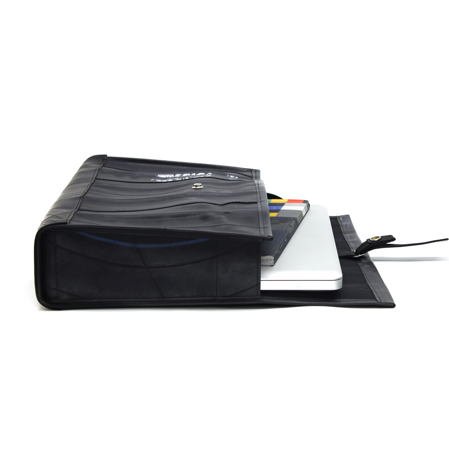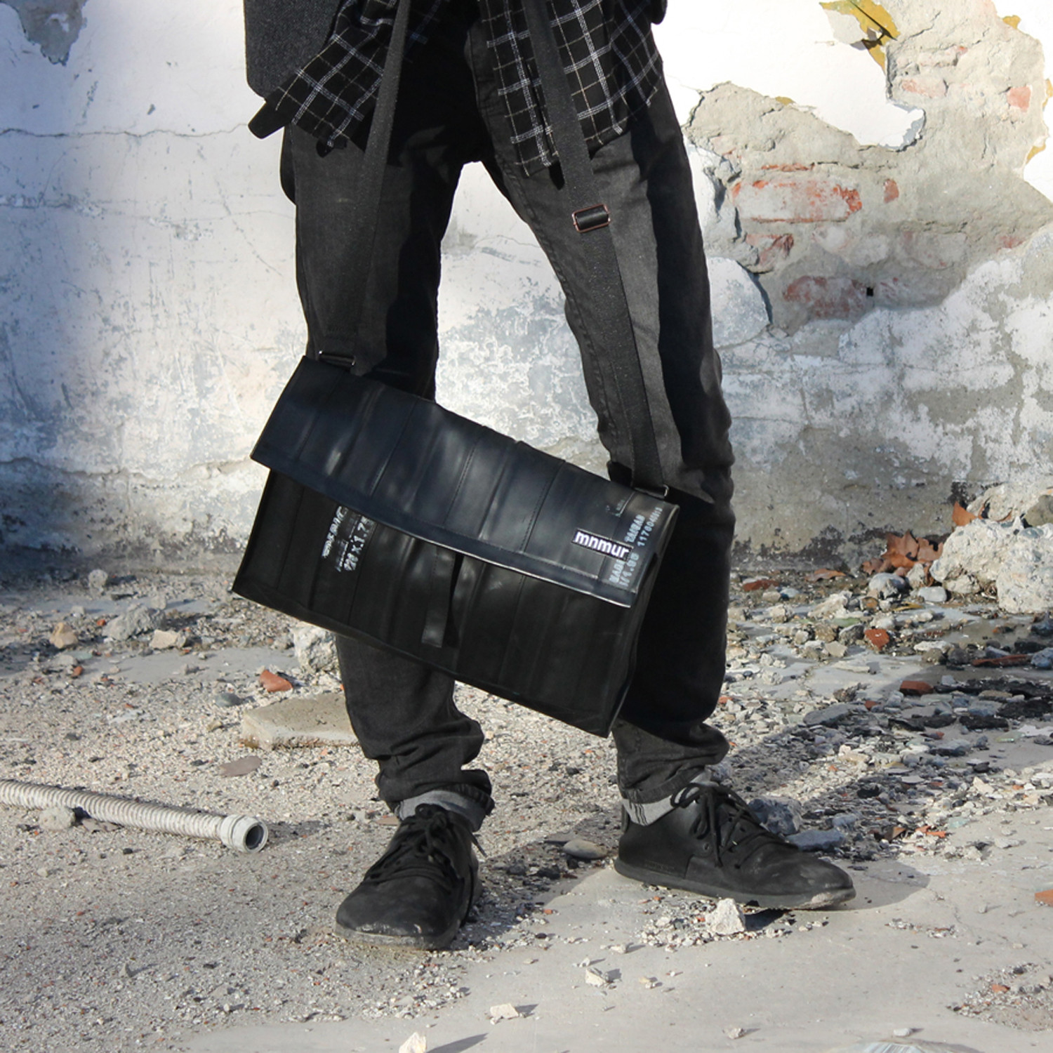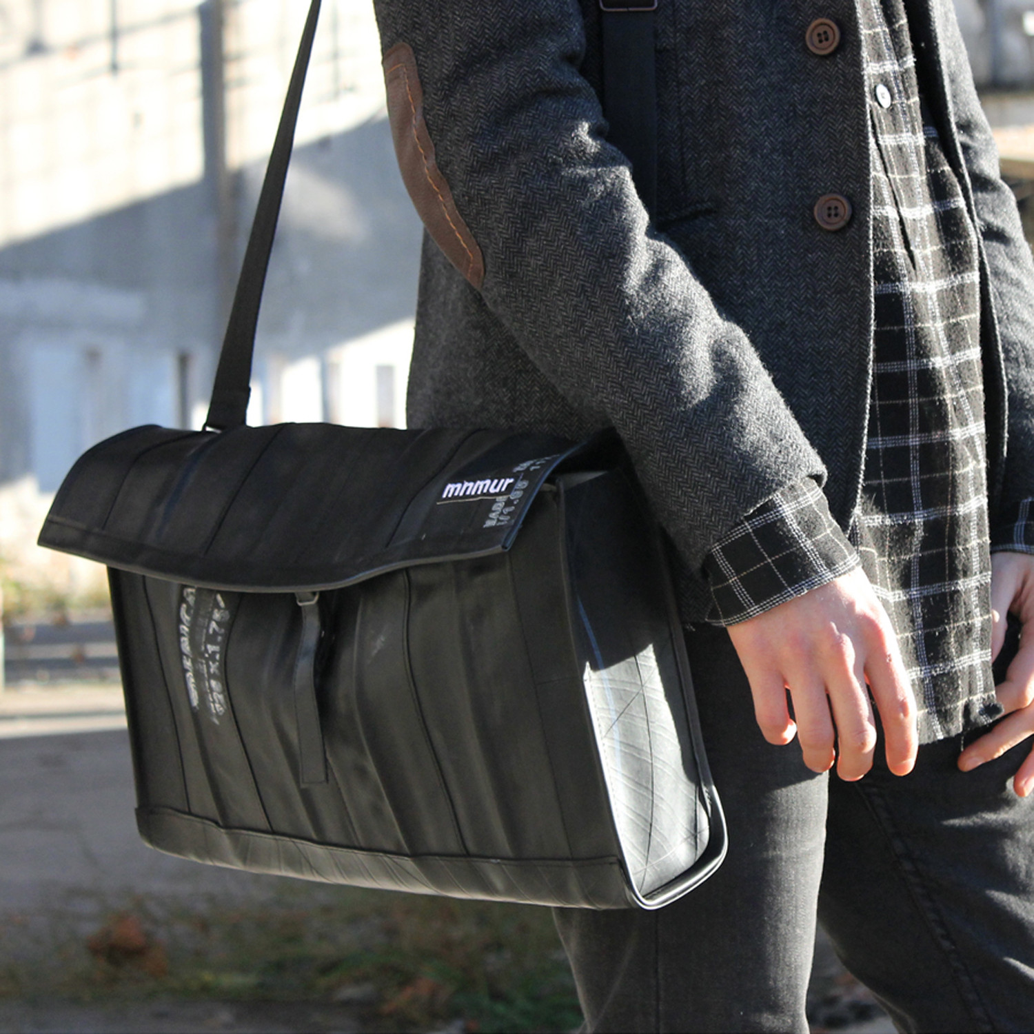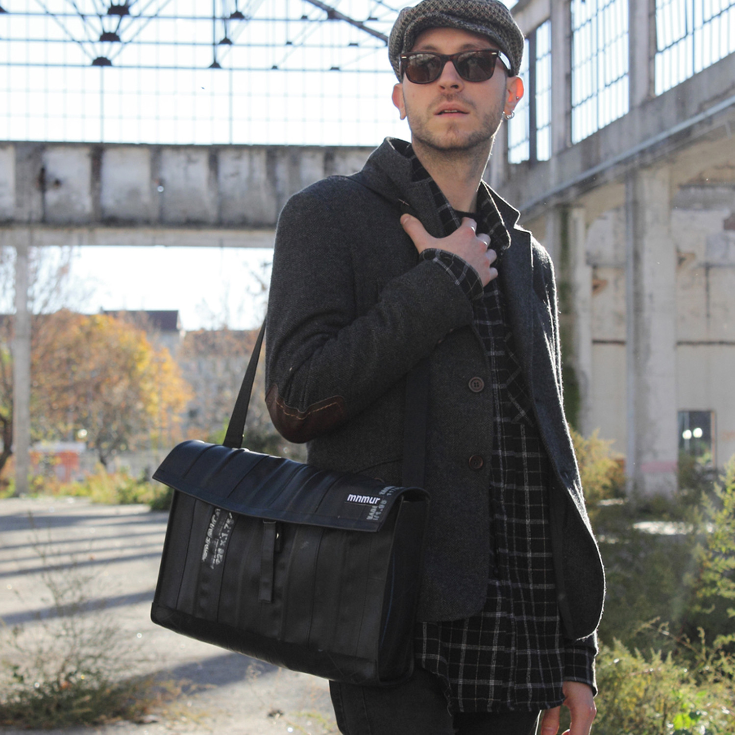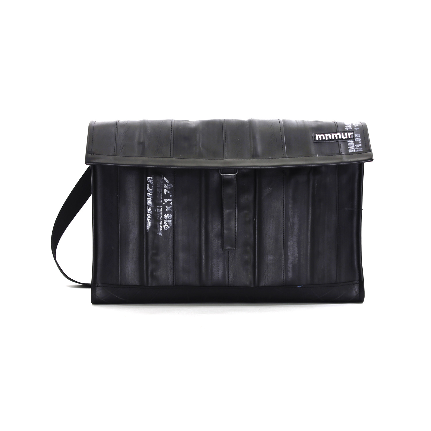 This bag was upcycled from utilitarian materials into a gorgeous commuter bag for you. With room for your laptop, books and notebooks, this piece is perfectly functional with superior details. It has a zippered internal pocket, black fabric lining, button fastening and water resistance.