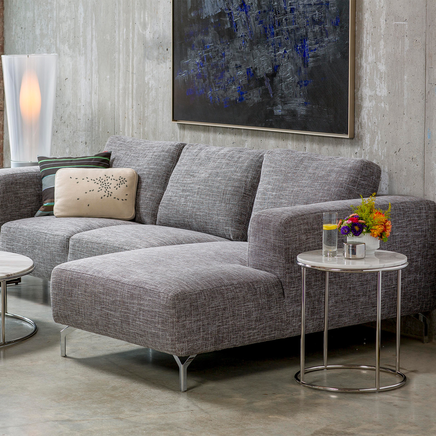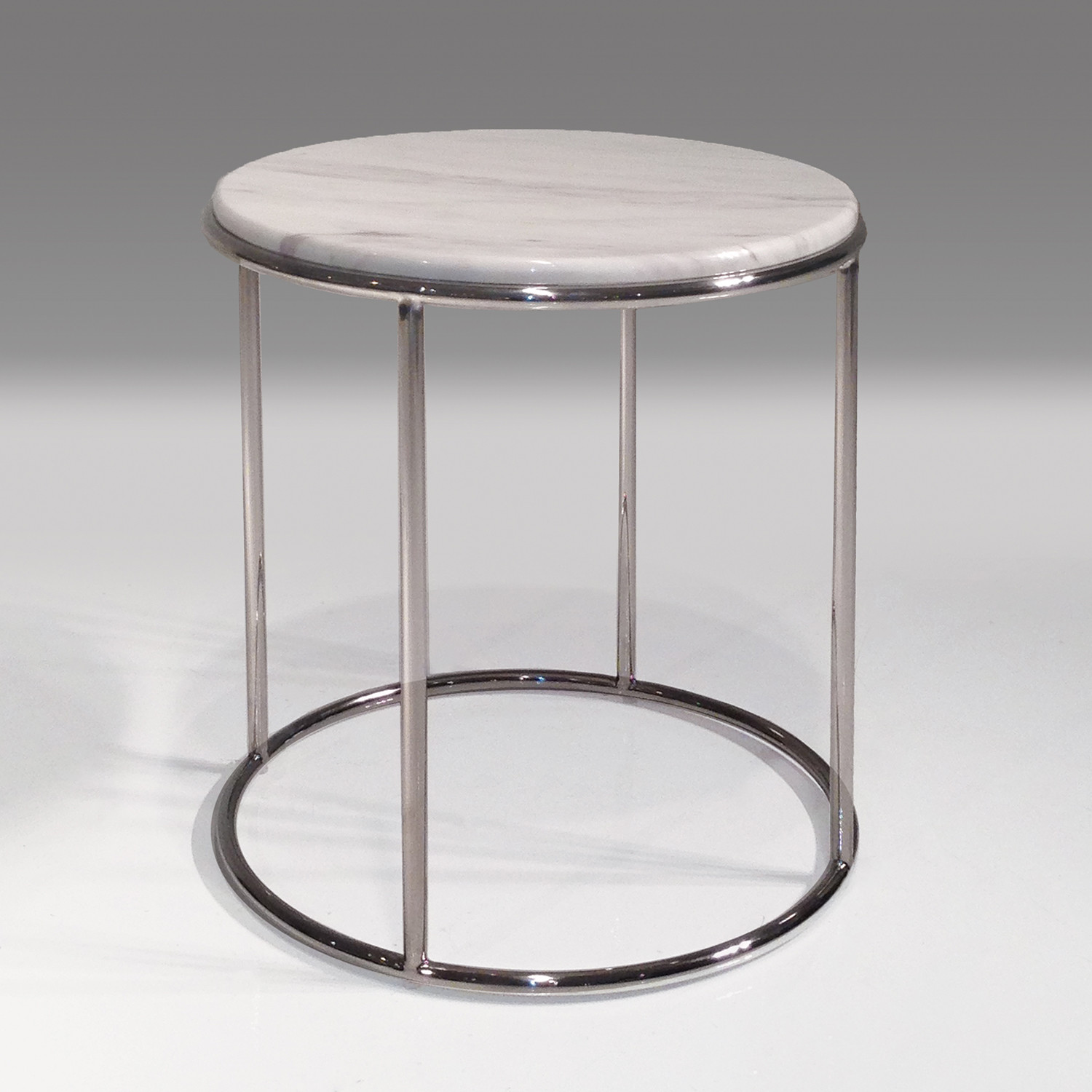 The ELYSEE series is made from Volakas marble, a stone from Greece. It features a warm grey and cream vein and is clear coated to make it the perfect surface for everyday use. A polished steel drum frame finishes the table off beautifully.