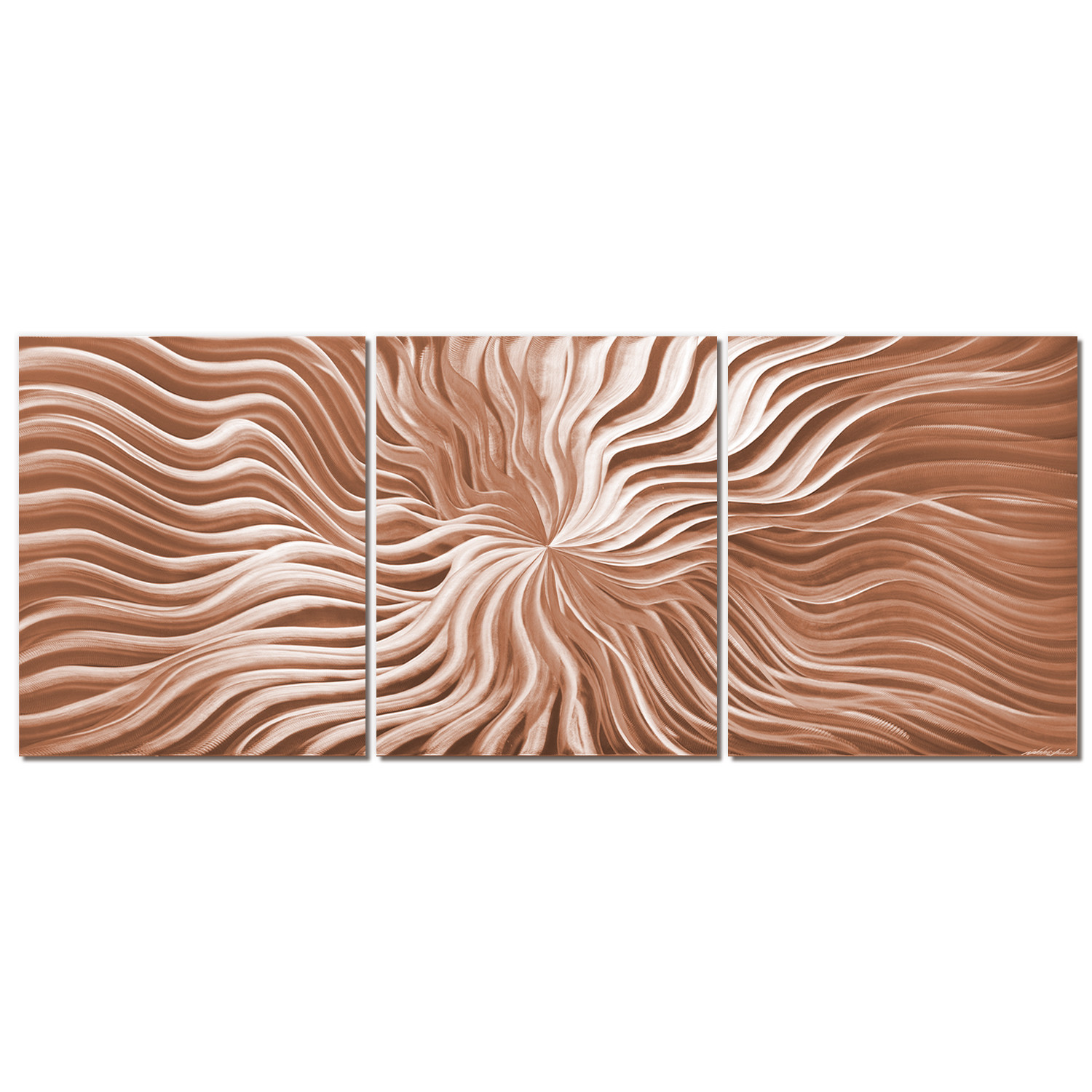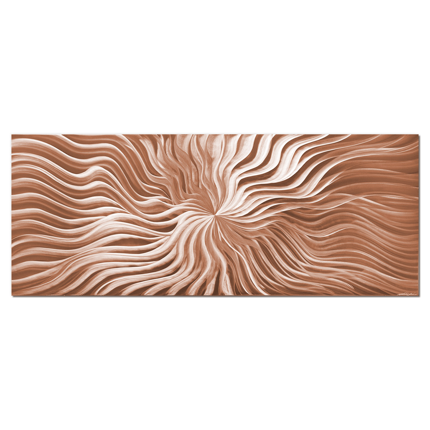 Resembling Nicholas Yust’s popular ‘Tantalum’ design, Flexure is a captivating multi-panel metal wall sculpture, now crafted in pure, natural copper. A captivating multi-panel metal wall sculpture that is certain to thrill and captivate those fortunate enough to see it live, it is as if a beautiful starburst is being seen through the waves of the ocean, the light reflecting off of the glassy surface. As you lose yourself in the artwork and allow your imagination to wander, you may find yourself imagining that this is just what a star might look like to a mermaid. Flexure also possesses a sort of hypnotic pull. The longer you look at the metal wall art, the more drawn you become to the beauty of the flowing lines — following each one from the edge to the center.