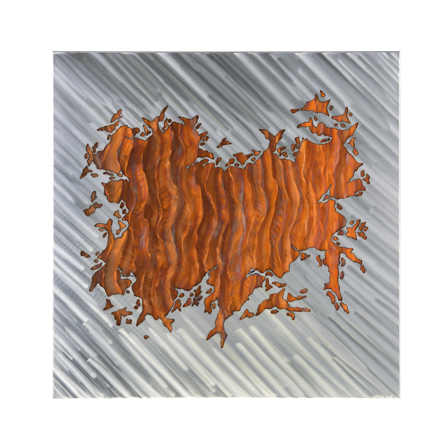 It is a dual-layered structure, with a ground and torched copper sheet behind a plasma-cut aluminum panel. The front panel is a decoratively ground aluminum panel with angled streaks invoking motion and activity, with the accuracy and consistency that is a staple of Nicholas' work. Both the grind pattern and the material is contrasted beautifully with a torch colored back panel, which features a vertical wavy grind that seems to be pulling at the ends. The copper is creatively exposed in a gaping hole that Nicholas cut out with his plasma cutter. The dual layering technique gives this metal wall sculpture visual depth and natural shadowing.