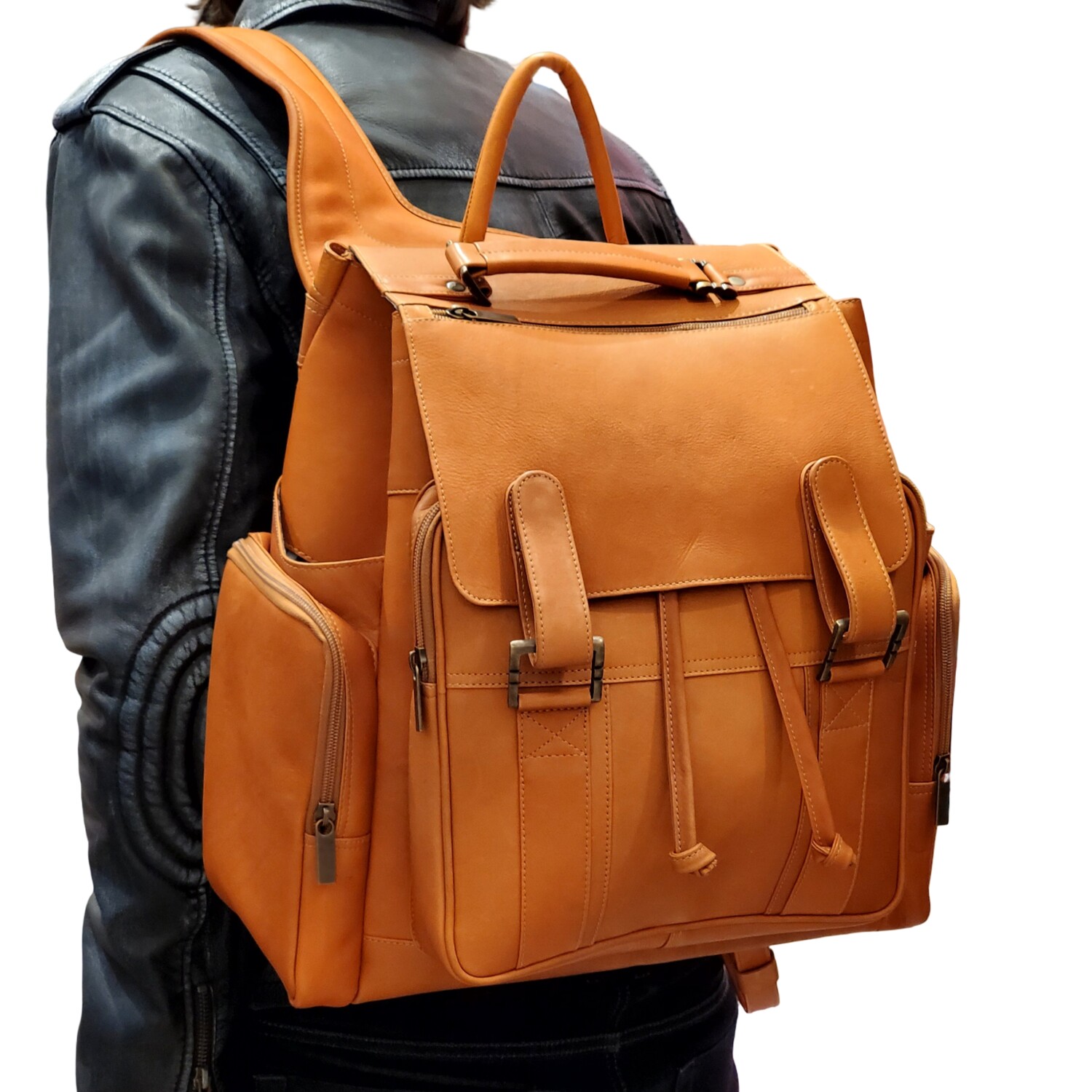 Genuine Handmade Vegetable Tanned Natural Vaquetta Leather extra-large back pack with eight pockets and a roomy main compartment for organizing your gear. Under the front flap with magnetic closures, you'll find a gusseted front pocket with pen holders. On the sides, there are two slash pockets and two zippered pockets perfect for cell phone or sunglasses. The top flap has a long zippered pocket across it. There's a rear zippered pocket and zippered security pocket inside too. The aluminum top frame adds structure to the pack. Carry it by the top handle or the padded, adjustable shoulder straps.
