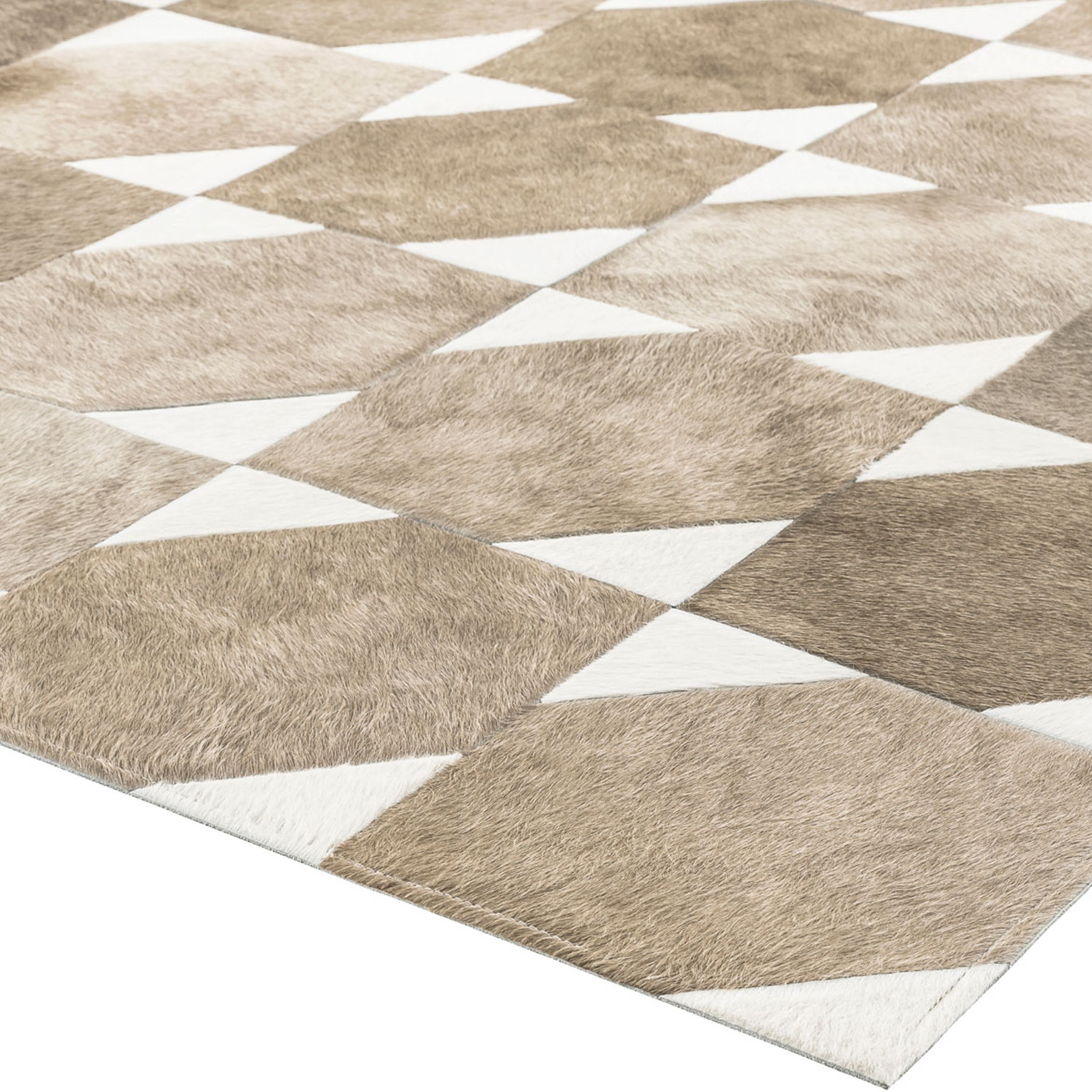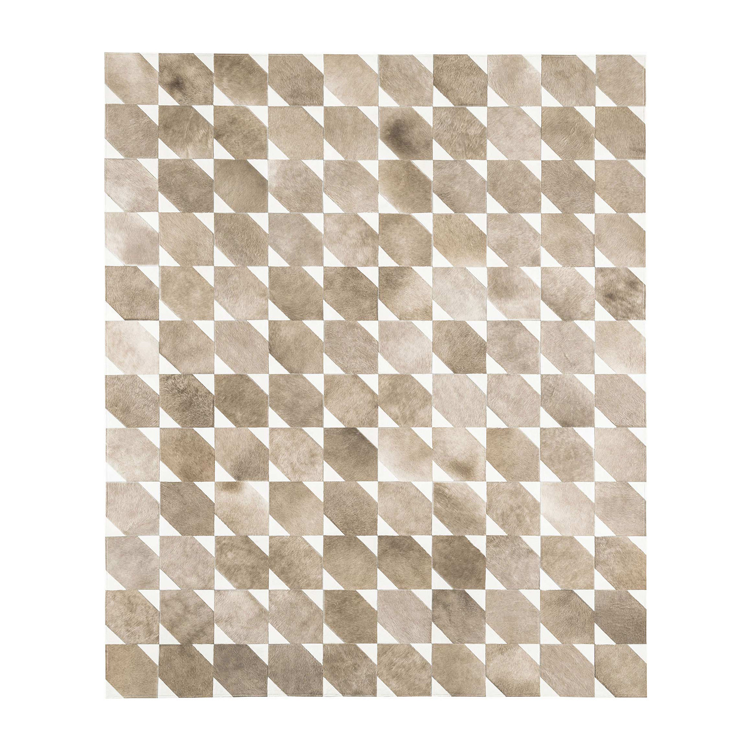 Modloft's rugs are crafted from 100% natural Brazilian cowhide. Sewn by hand, each one is remarkably individual in its look, and features a resilient canvas underbelly with no-slip corner grip technology. The Bisset is one of Modloft's more uniquely patterned rugs, utilizing opposing white corners against a tasteful pearl-beige palette to create an illusion-like façade.