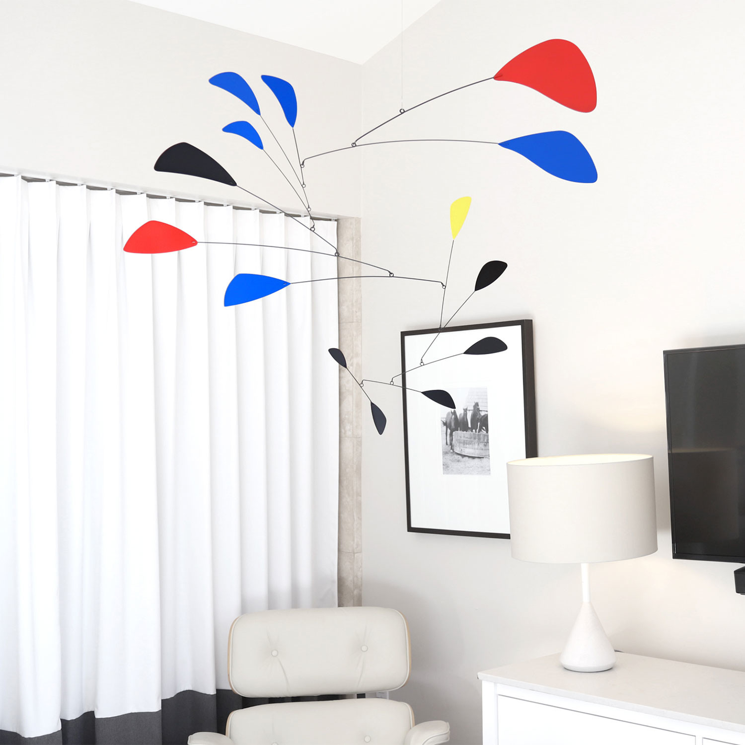 Elevate your home decor with this collection of hanging mobile sculptures from Modmobiles. Featuring a mid-century design, each stand-out sculpture has intricate shapes and bold colors for a unique addition to your home decor.