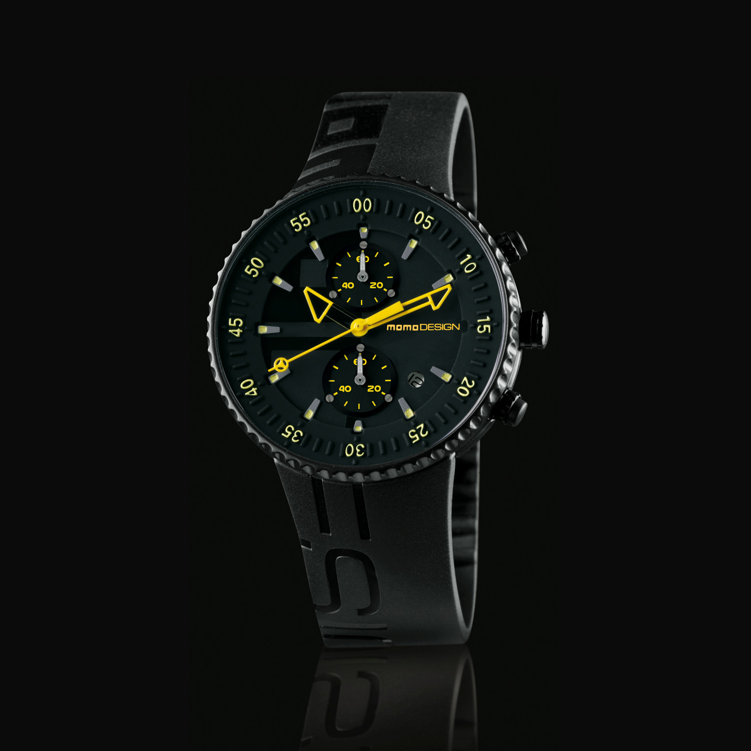 This watch is a chronograph stunner with lovely yellow accents. It features stainless steel material and water resistance to 5 ATM for your seafaring adventures.