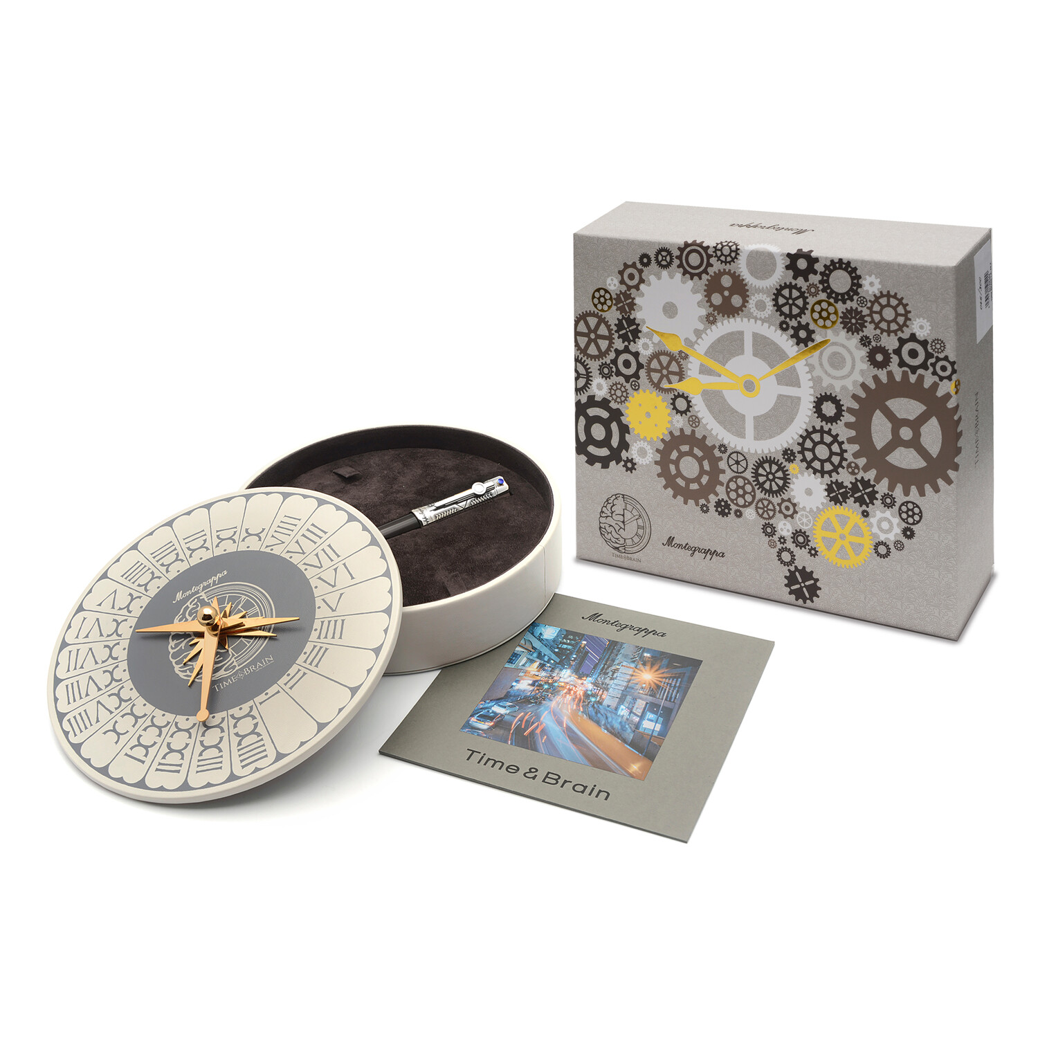 The barrel, divided in 3 sections, represents the past, present and future. A gold brain is attached to the back side of the cap. The clip, shaped like a pendulum in Art Deco style, is surrounded by decorations that symbolize the sun, the moon and circadian rhythms. The 18kt white gold nib features a design symbolizing thought and the passing of time: a clock and a brain divided in half. Presented in a special circular time-piece case with rotating hands and an exclusive 104-page book by Prof. Restak.