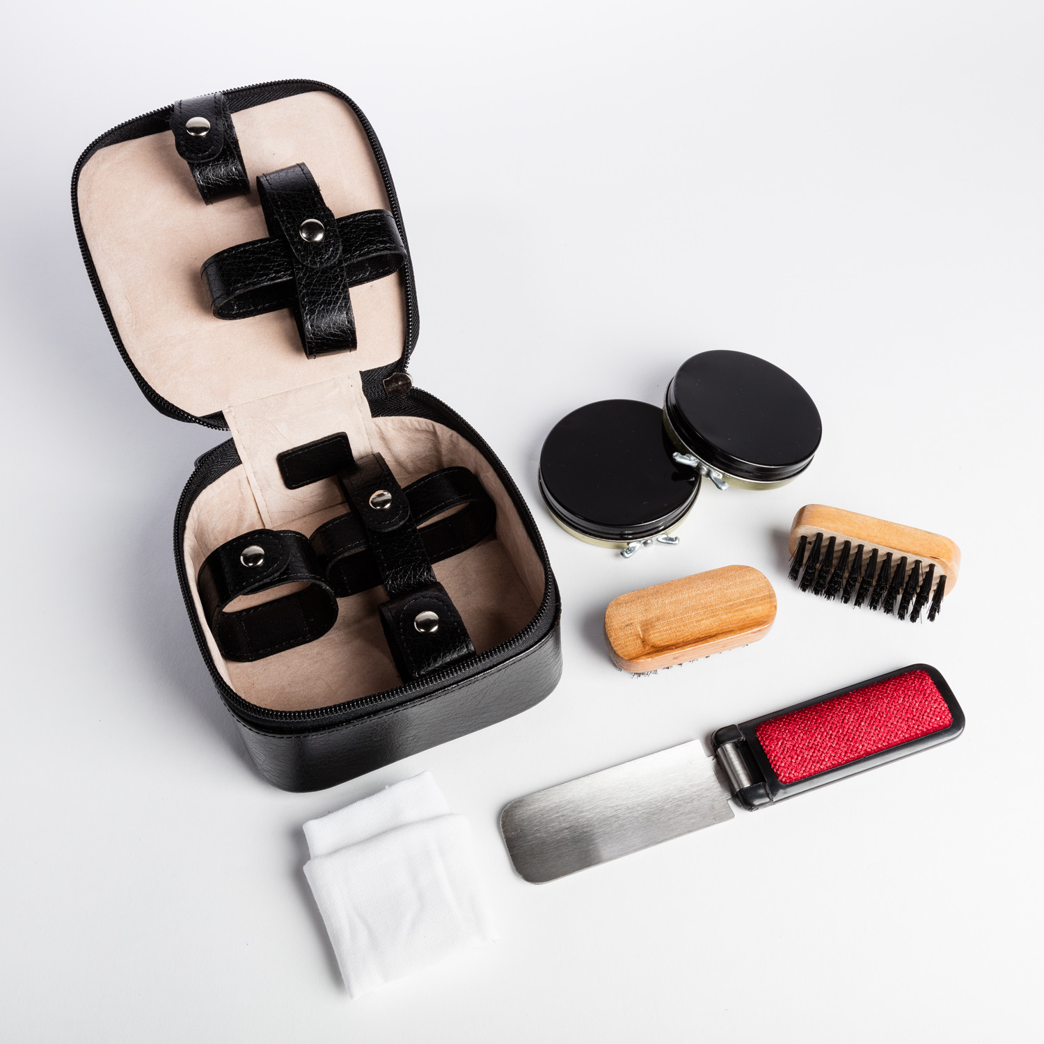 This compact and practical kit has everything a man needs for his shoe care. The zippered case includes two kinds of polish, brushes, buffers and a shoehorn. Perfect for the home or for travelling, it's made from Morelle's signature embossed fine grain black leather for added class.