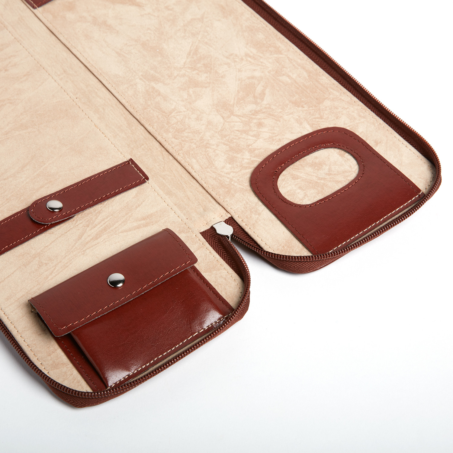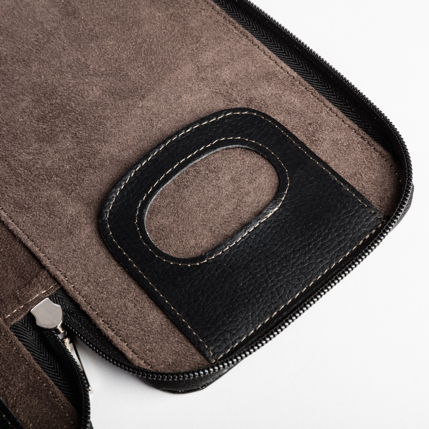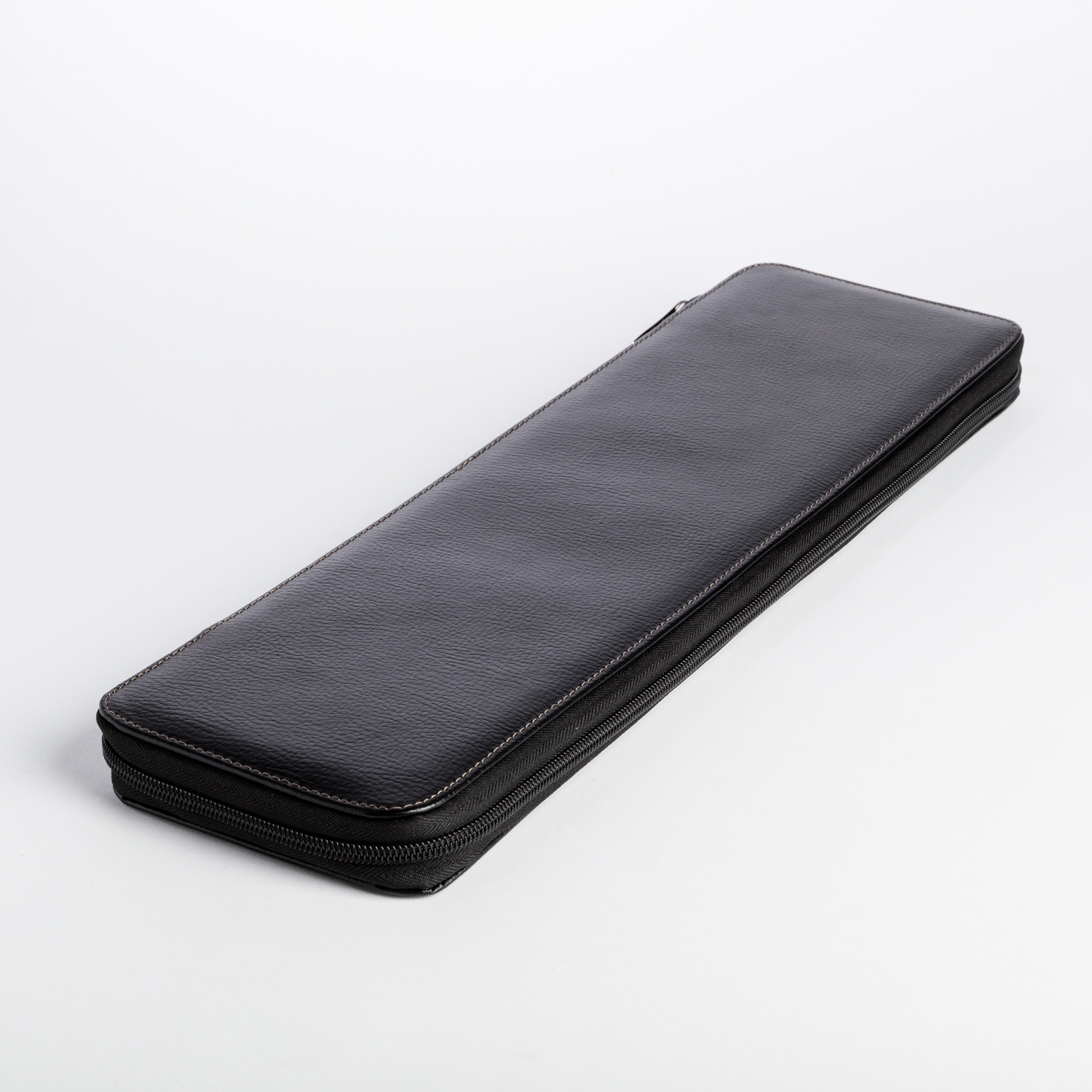 This executive sleek zippered Roosevelt tie holder holds up to six ties. Its two snapped leather pouches are perfect for storing tie stays and cufflinks. With its lovely brown stitching on the black soft leather, it bespeaks quality and fine design.