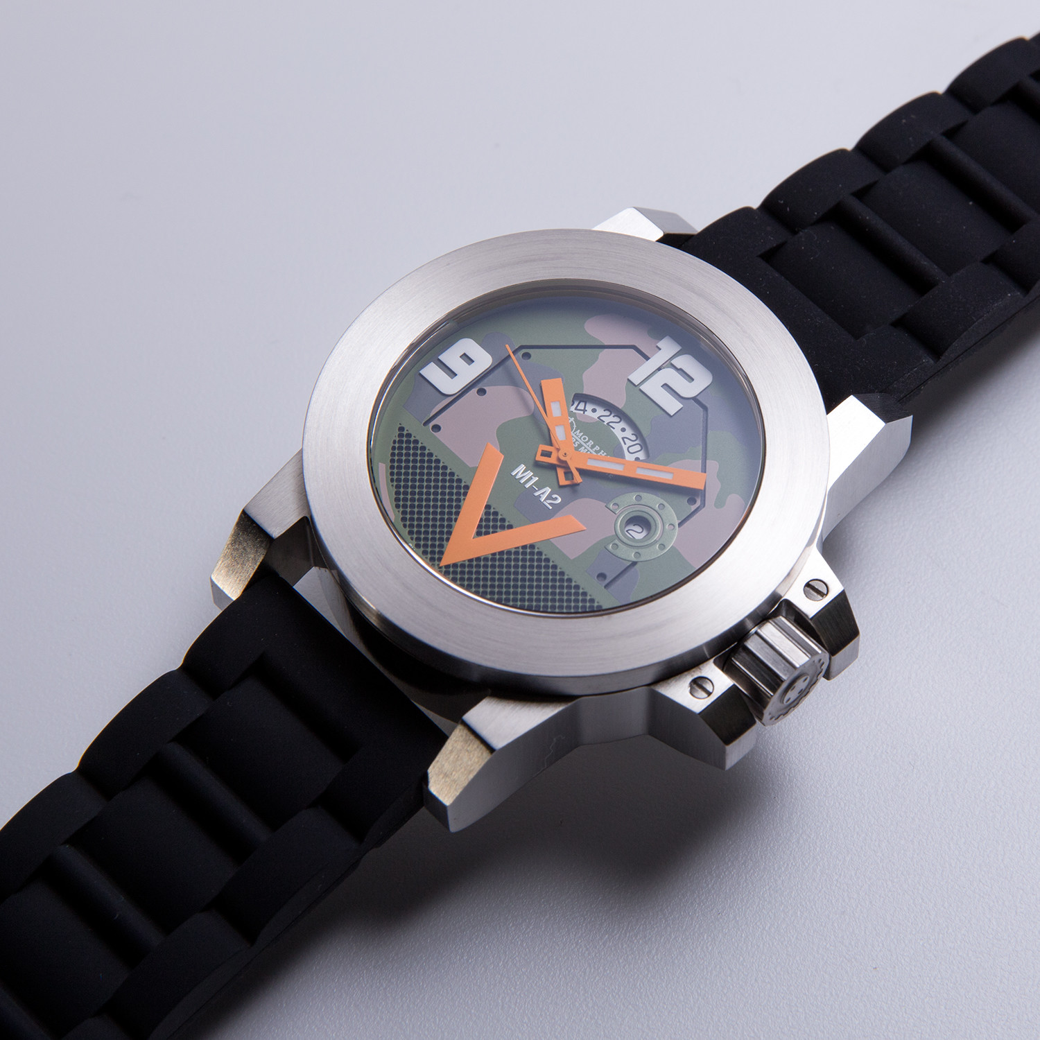 The M1A2 watch is based on the Abrams main battle tank, serving with the United States Army and Marine Corps. The watch features a Swiss made Ronda quartz movement with GMT military time displayed on a curved read-out. The watch features a date surround in the texture of the top machine gun mount, a lower dial texture grid formed after the back turret basket, and etched details on the dial following the turret shape. The thick case is shaped like a generic tank commander's cupola, while the screw down crown is designed after a road wheel. The black silicon strap has track-like textures.