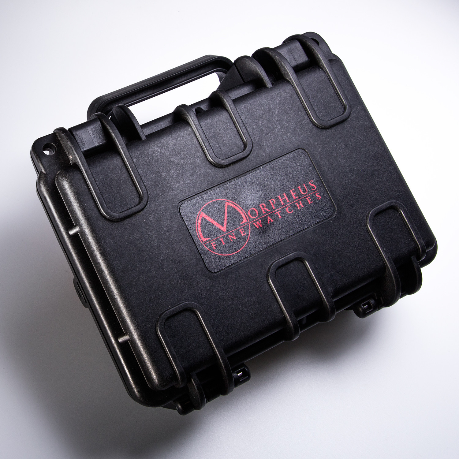 Fully custom themed design based on the classic 1911 .45 automatic pistol designed by John Browning and used by the United States military for over 100 years, this striking commemorative watch features 18k gold plating, a Swiss made Ronda quartz movement, thick sapphire crystal, and screw down crown for added water resistance (5 ATM). The robust case is 45mm in diameter and 14.25mm thick.
