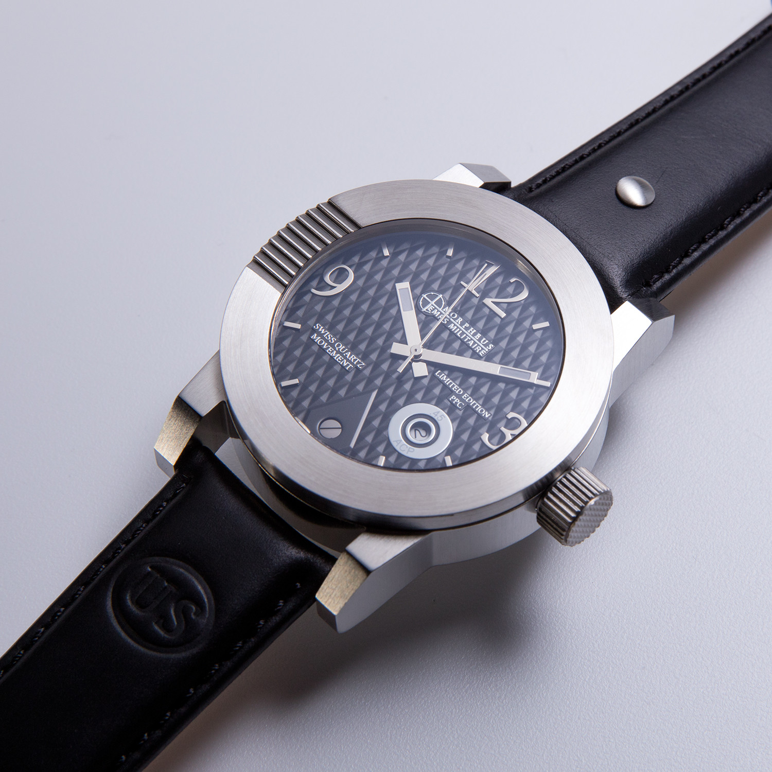 The unique dial features the pistol grip texture of the original firearm, along with the classic nib and screw at the 6 location. The date window surround is in the texture of the back of a .45 ACP round, and the bezel features the slide grooves. The dial fonts match the original pistol's and the crown is textured to match the spring cap. The black leather strap is designed after the original WWI style Army holster, complete with 'US' embossed on it and a matching stainless brad. This watch variant is limited to just 450 units, and each one is individually numbered on the caseback.