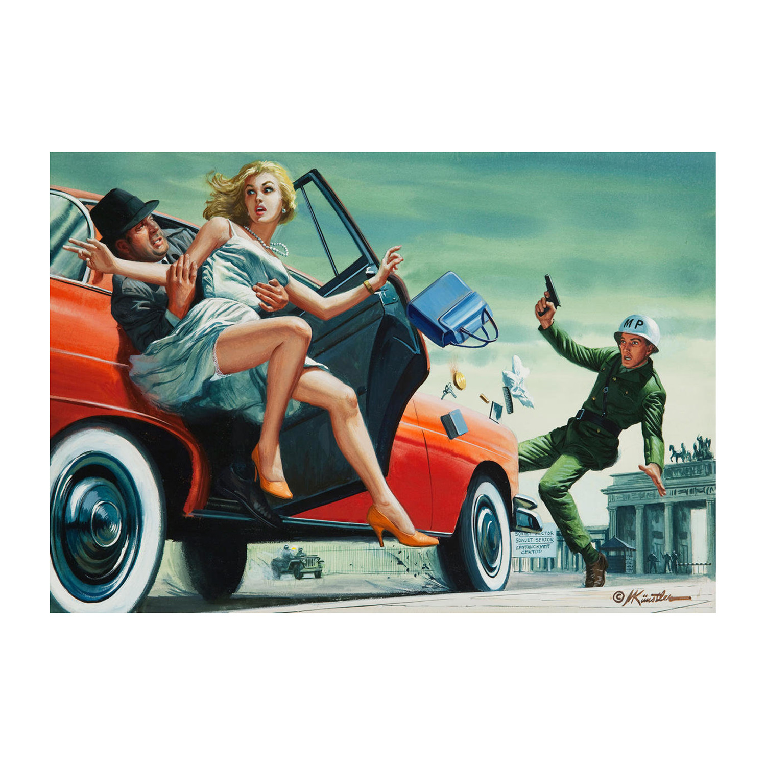 Considered by many to be the premier historical artist in America Mort Künstler is known for his vibrant and intricately detailed illustrative paintings. Before his rise to fame depicting the American Civil War, Künstler began his career in the 1950s as a freelance artist, illustrating captivating and sometimes provocative images for book covers and men's adventure magazines like Stag, For Men Only, and True Adventures, to name a few.