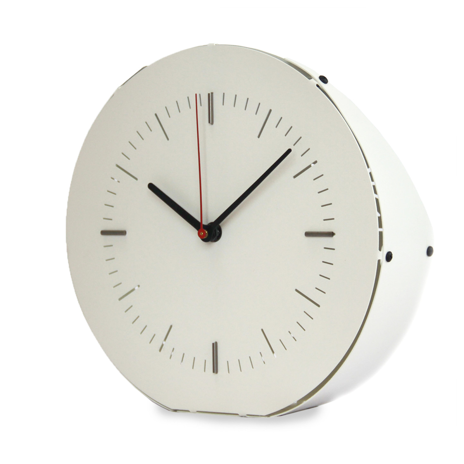 The AboutFaceClock is designed by architect Mark Ejnes to be many clocks in one. A clever new take on a centuries old invention, this clock hangs on a wall, corner or ceiling at virtually any angle and facing any direction. Attach the custom ‘puck’ hanger to any surface and simply hang the clock in whichever direction you choose by using any of the slotted holes on the back. The innovative AboutFaceClock is sculptural and playful and offers a practical way to tell time from many different angles within a room.