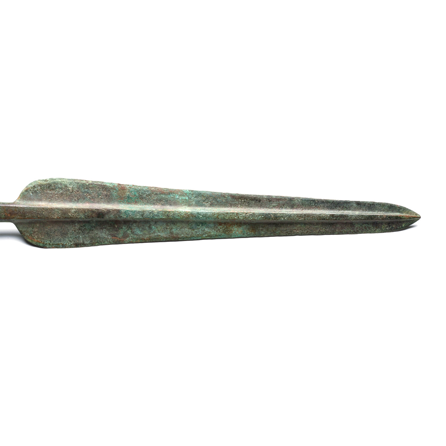This long bronze spear blade has a tapered double edge blade and central raised blood ridge, long tapered tang. Overall strong blue-green surface patina.