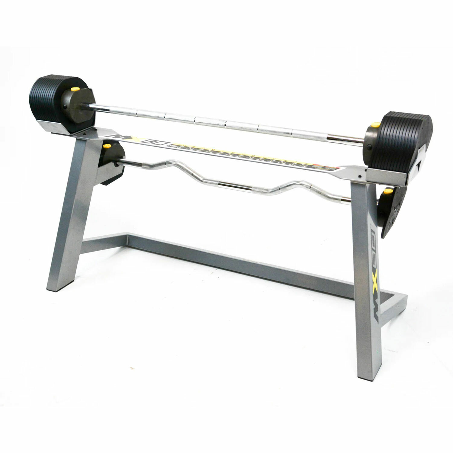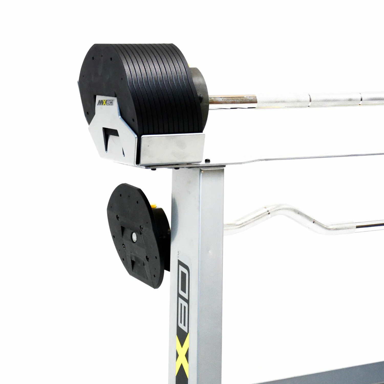 Upgrade your at-home gym with the MX80 Rapid Change Barbell System. This space-saving design replaces 13 barbells and 13 fixed EZ-Curl bars with one compact, balanced, and secure design that looks great wherever you place it.