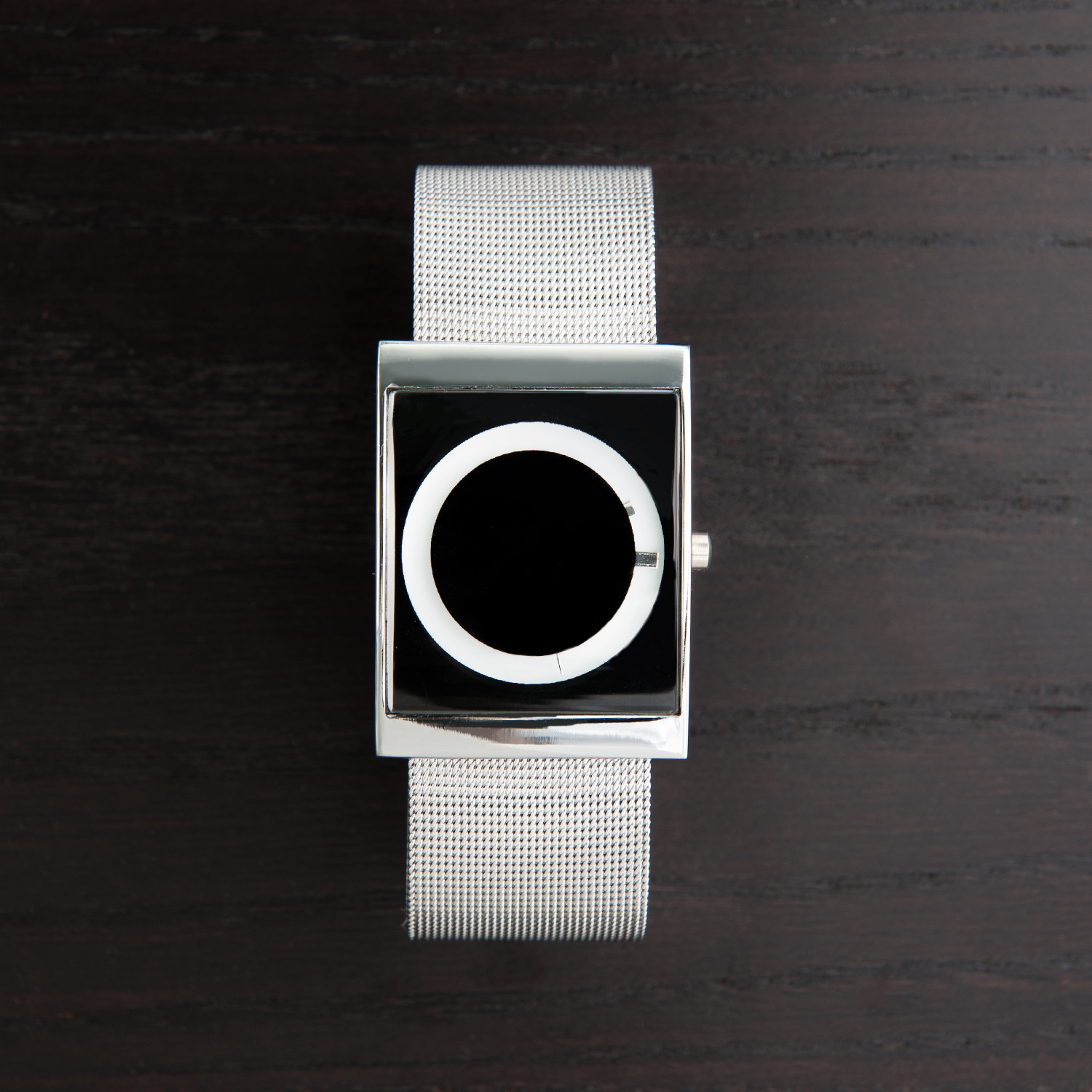 The Eclipse has a Japanese quartz movement, special mirrored surface to reflect the light, stainless steel band and mineral glass dial. The look is sophisticated and minimal.