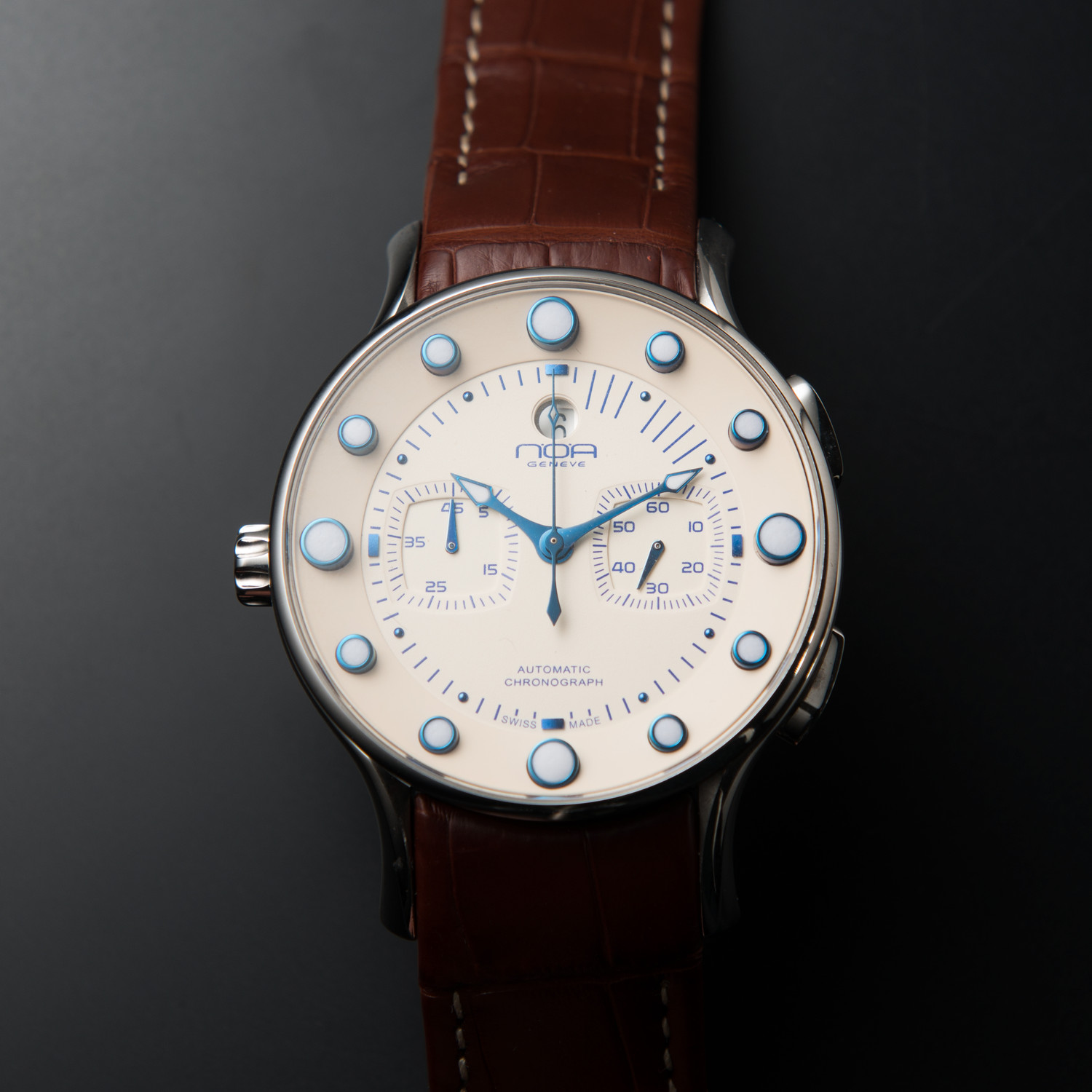 This Automatic Chronograph is a modern, everyday timepiece born out of the legacy of Swiss watchmaking. This handsome piece features clearly visible markers and N.O.A.'s signature inner ring for enhanced functionality.