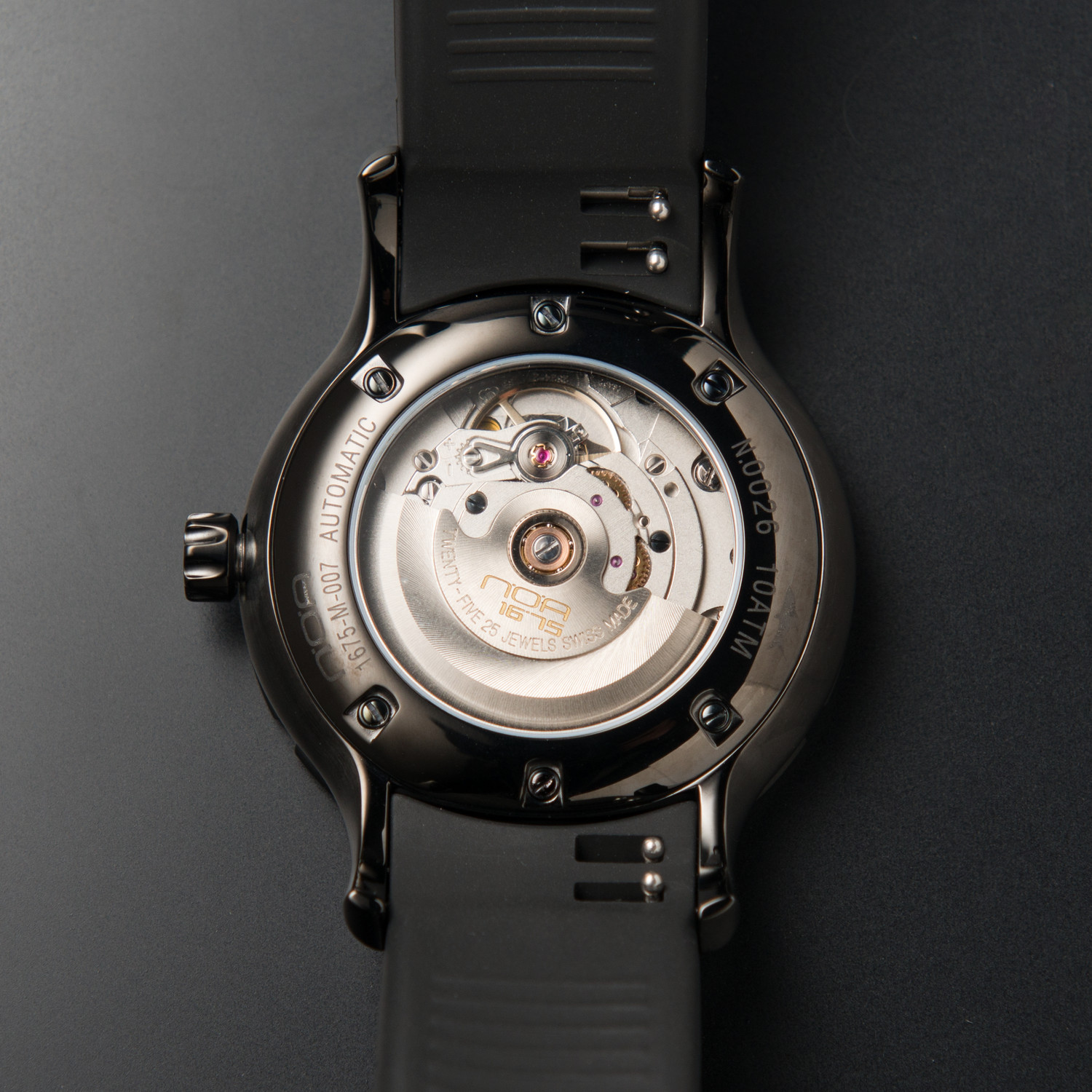 Black on black on black... that's the NOA // M007, with black dial markers, a black face, a black case, and all sitting on... yep. A black strap finishes the look.