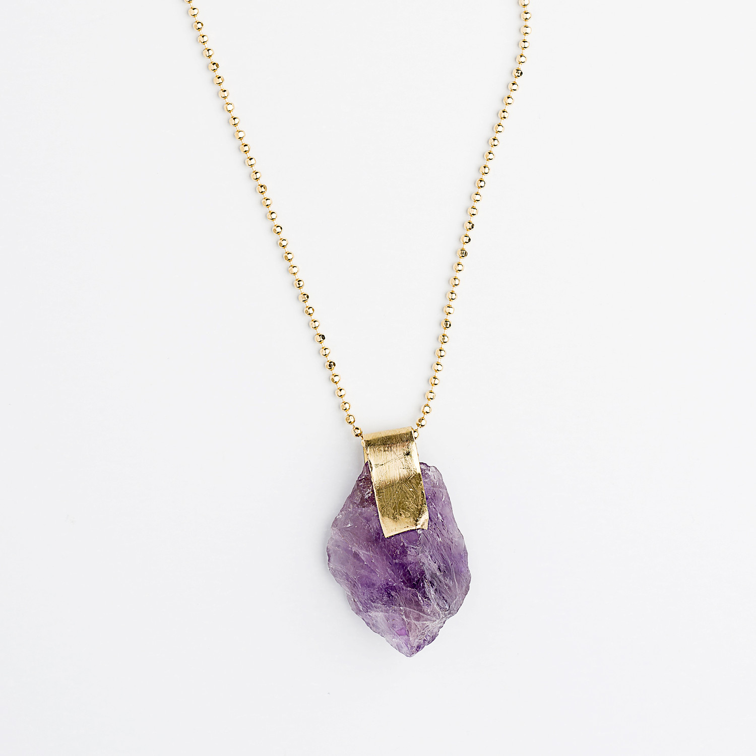 The Small Amethyst Necklace features amethyst, the stone of spirituality and contentment. It clears the aura and stabilizes any dysfunctional energy within the body. Each piece has been set in brushed brass on a 20" chain, and is guaranteed to be a one-of-a-kind and original setting.
