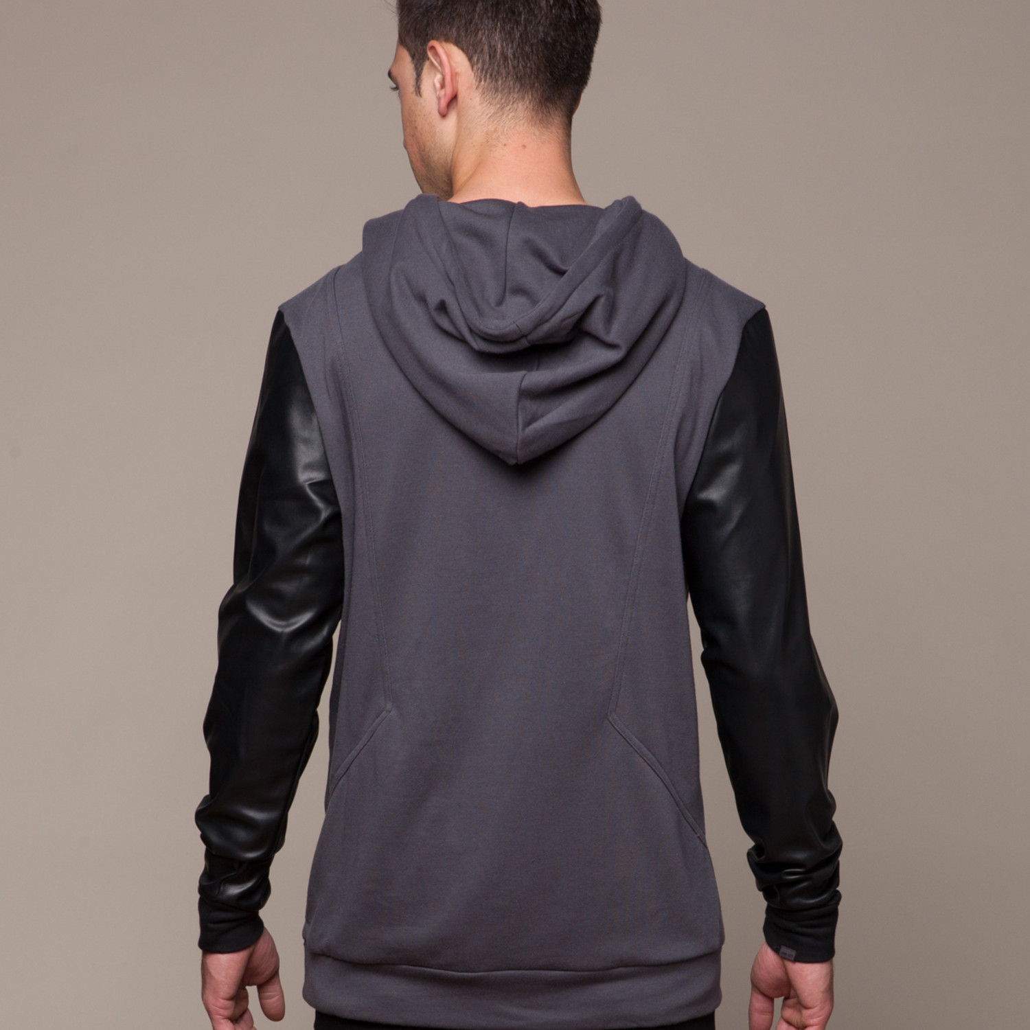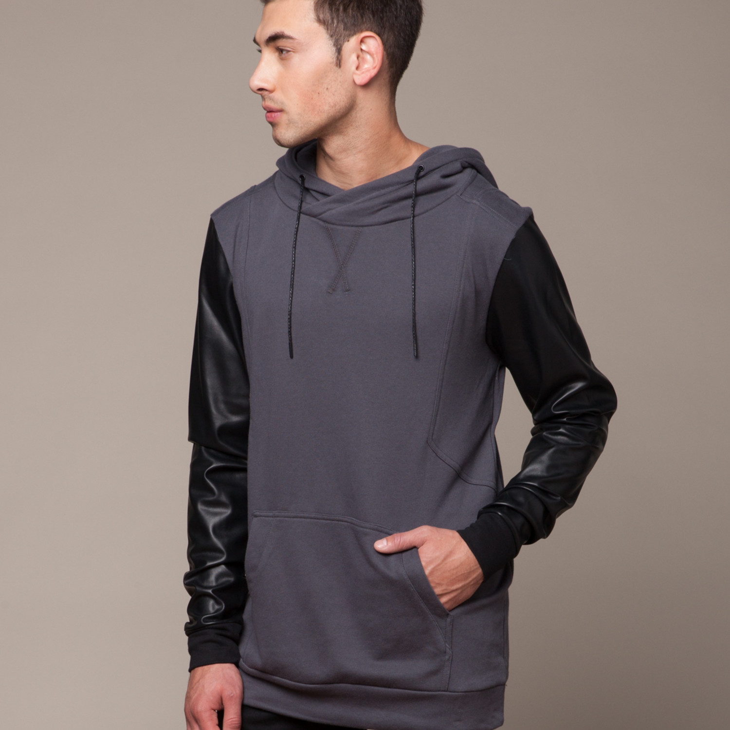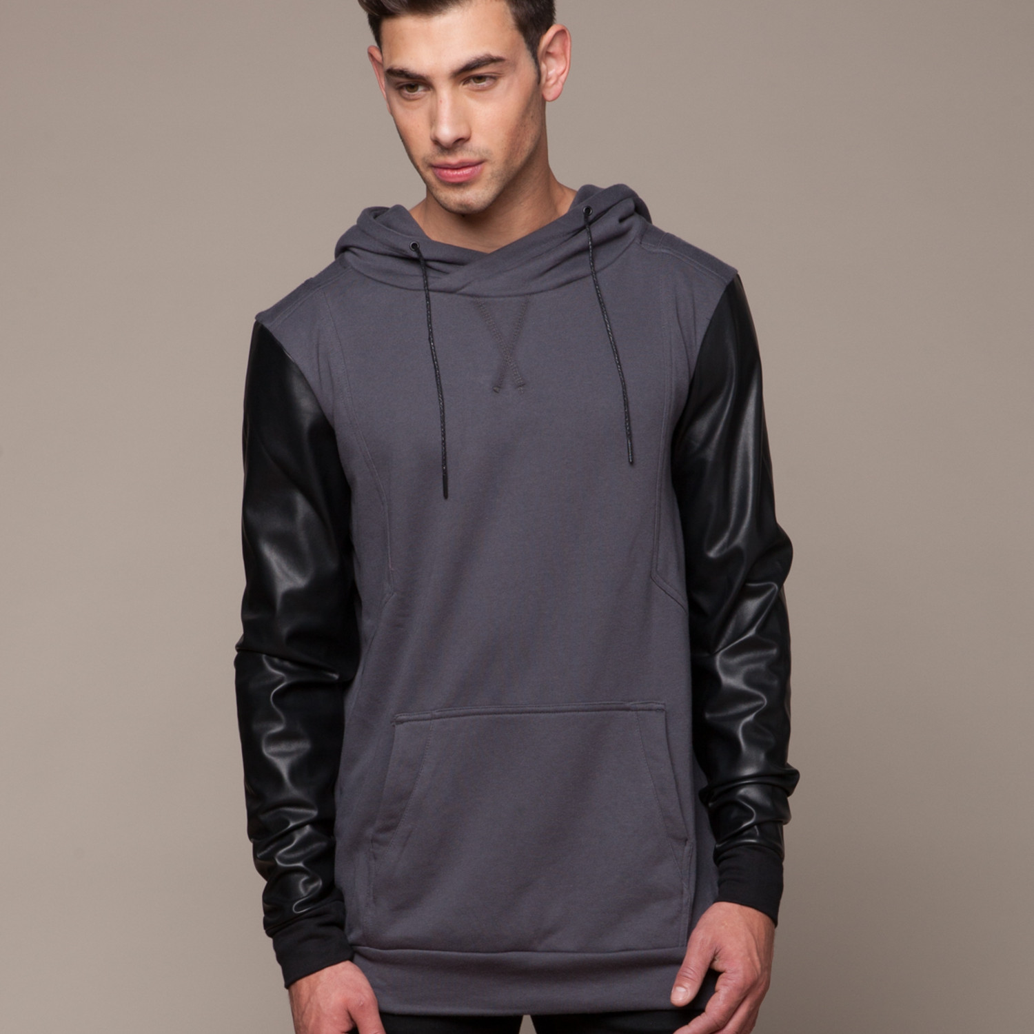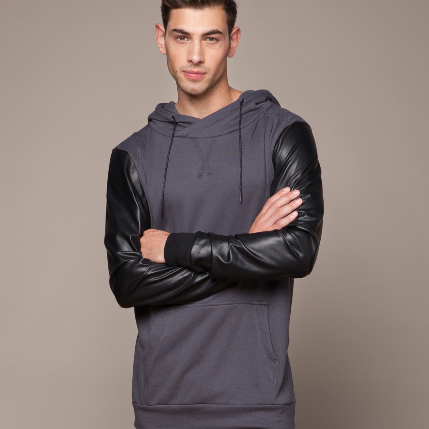 This classic hooded sweatshirt is updated with faux leather sleeves for a contemporary street chic style. Wear this sweatshirt with your favorite pair of jeans for a laid-back yet stylish aesthetic.