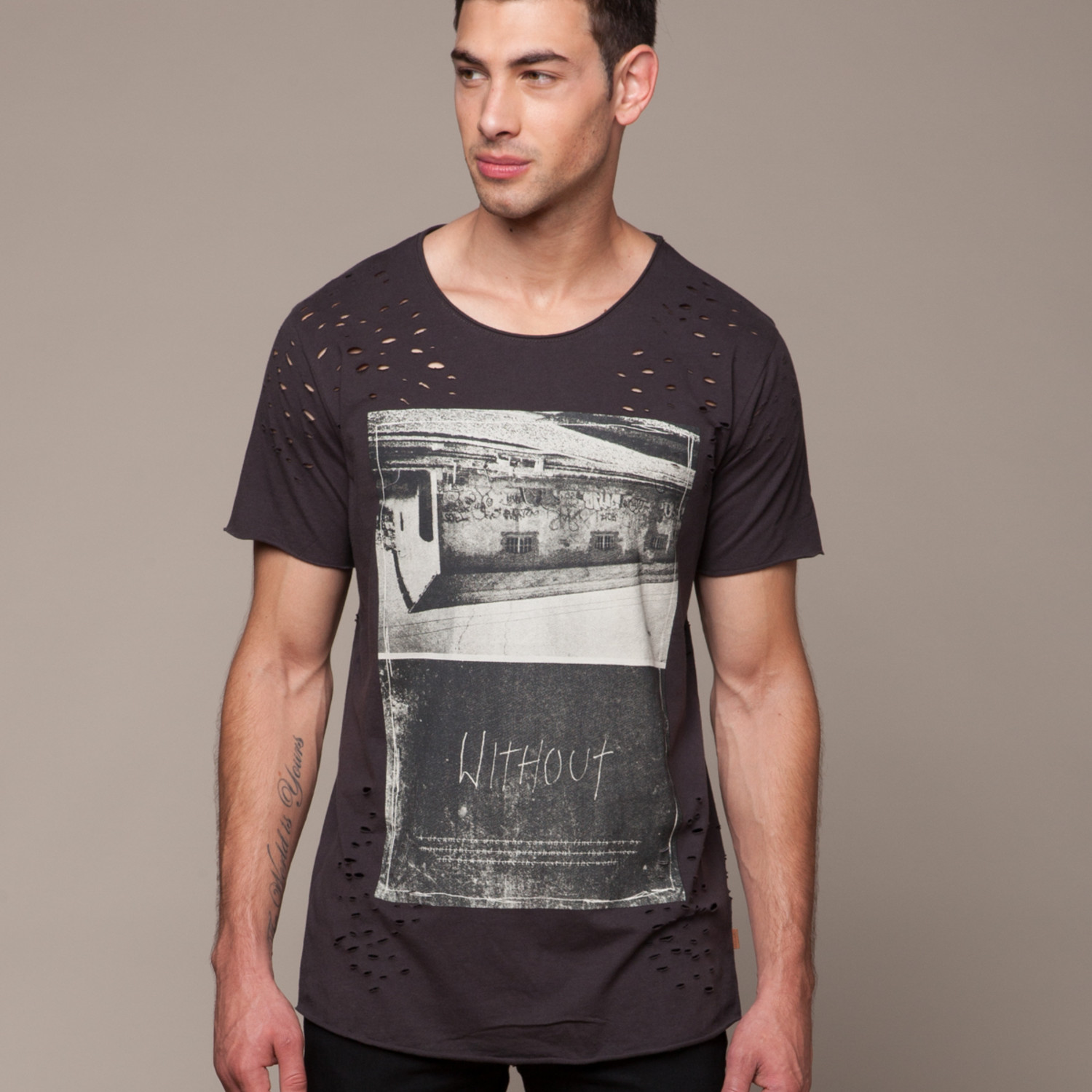 This casual-cool tee features a distressed finish, body cutouts, and raw hems for a vintage streetwear aesthetic. Wear it with your favorite jeans and sneakers for an effortlessly stylish look.