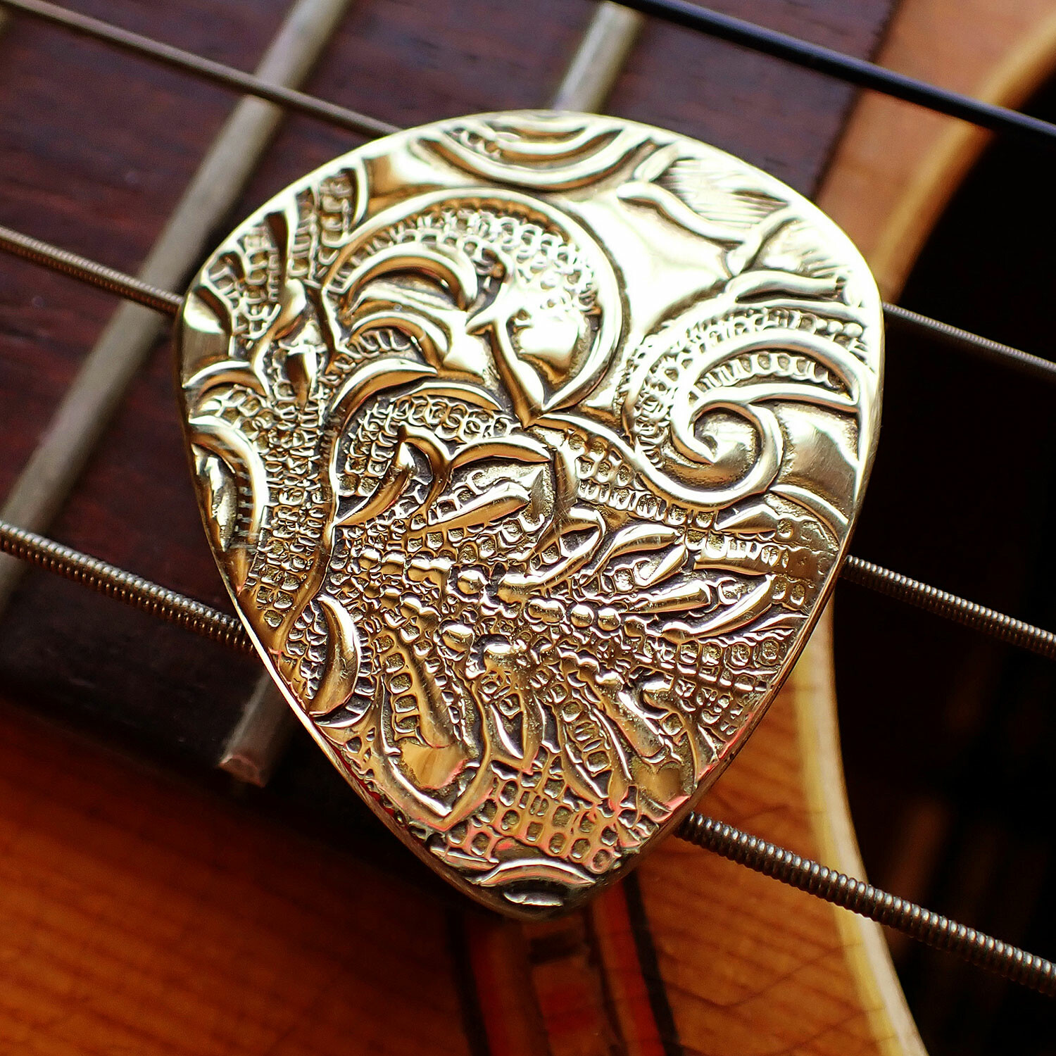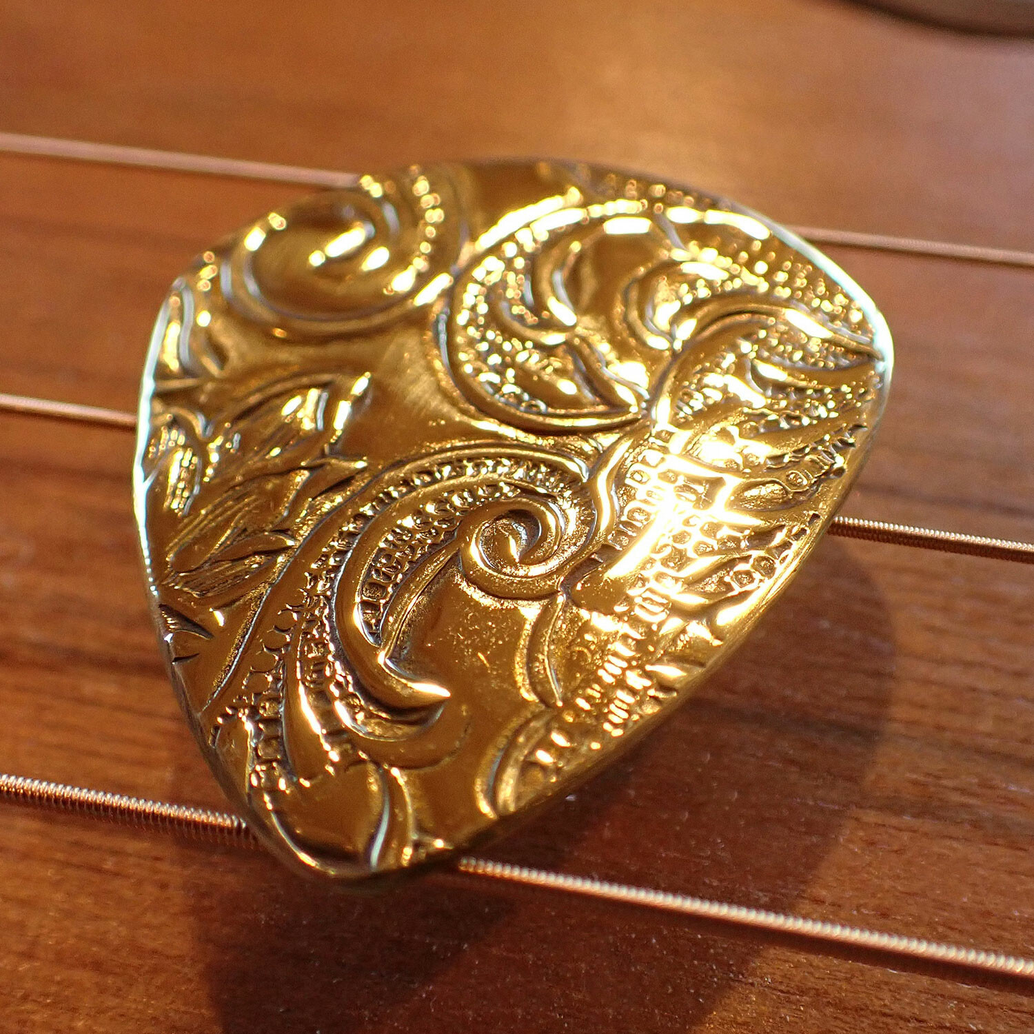Handcrafted from antique American brass by master picksmith Dustin Michael Headrick, this durable brass guitar pick features a deep floral/shell embossing on the face, smooth reverse, and a bright mirror polished gold color overall. The entire circumference of the pick edge is beveled liquid smooth for maximum performance and minimum string wear. The tonality of these picks are rich, bright, and harmonic, ultimately giving the instrument a completely new sound palette.