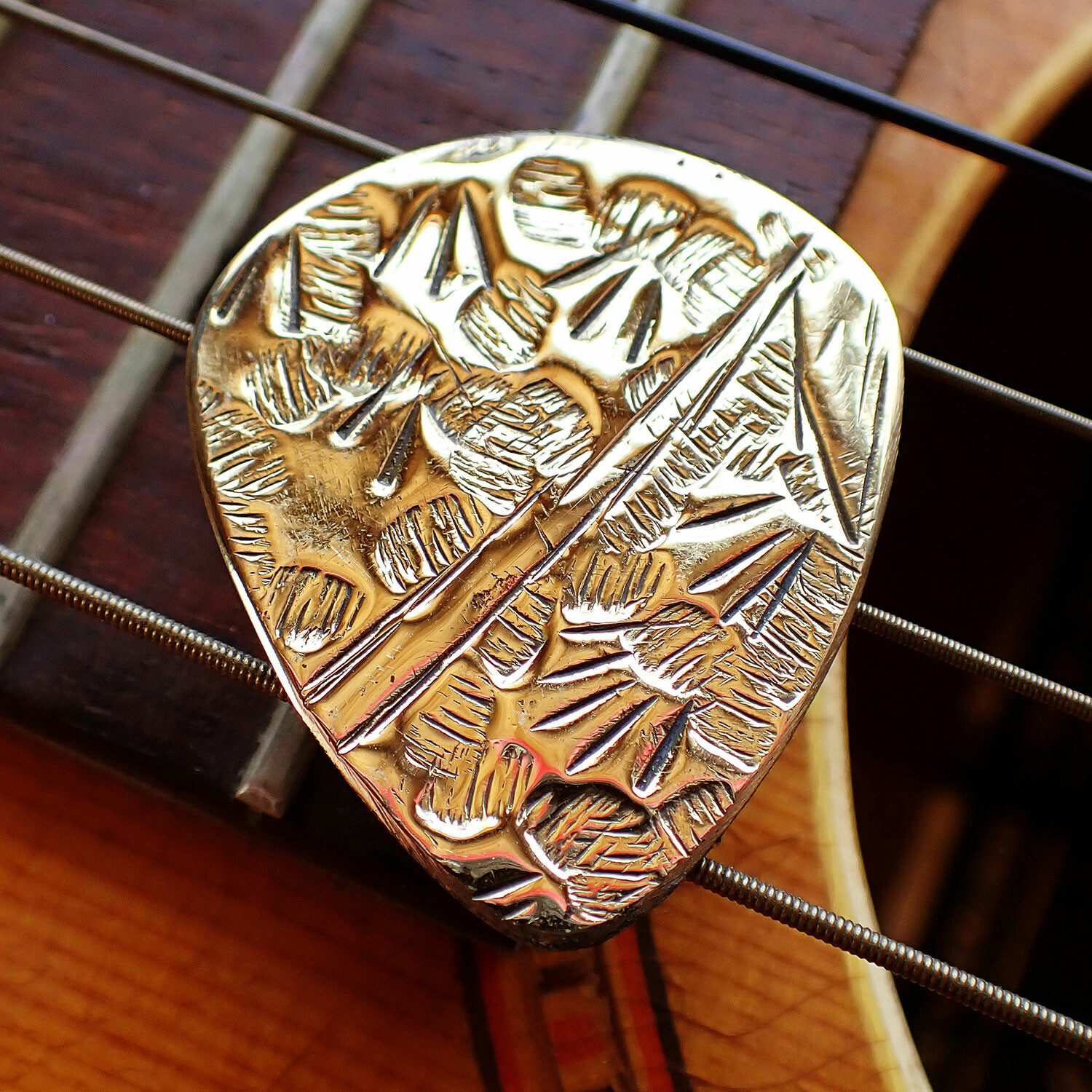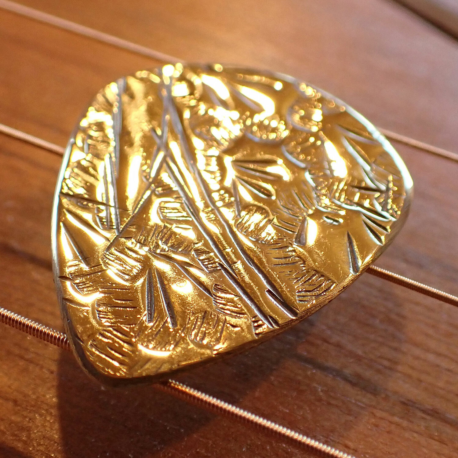 Handcrafted from antique Moroccan brass by master picksmith Dustin Michael Headrick, this durable brass guitar pick features a deep hammered pattern on the face, textured reverse, and a bright mirror polished gold color overall. The entire circumference of the pick edge is beveled liquid smooth for maximum performance and minimum string wear. The tonality of these picks are rich, bright, and harmonic, ultimately giving the instrument a completely new sound palette.