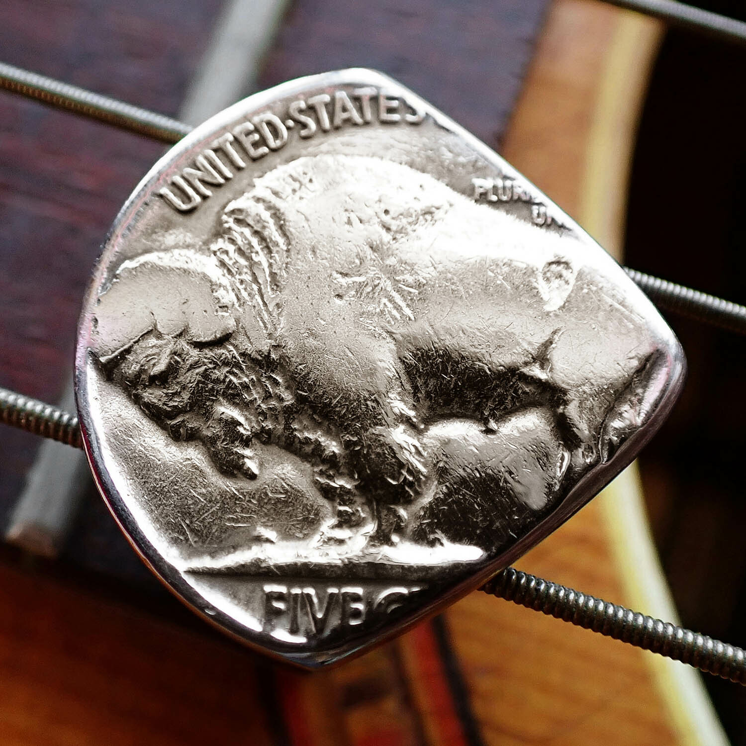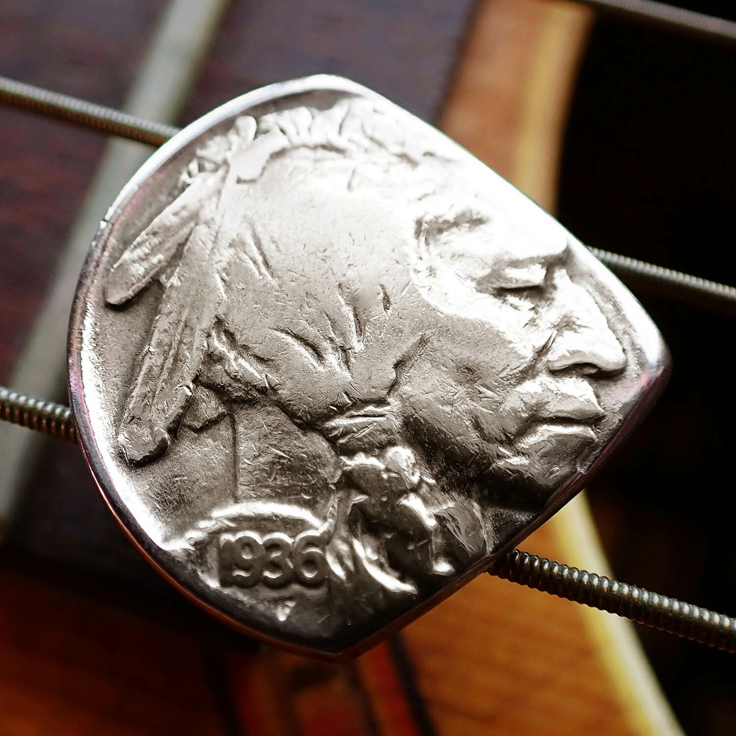 Play like the musicians of the past with this handcrafted coin guitar pick from master picksmith Dustin Michael Headrick. Originally minted in 1913 by the US Mint, the Indian Head Buffalo nickel features the profile of a Native American warrior on the face and an American bison on the reverse. This coin guitar pick has a finely polished surface and liquid smooth beveled edges for maximum performance and minimum string wear. The tonality is rich, bright, and harmonic, ultimately giving the instrument a completely new sound palette.