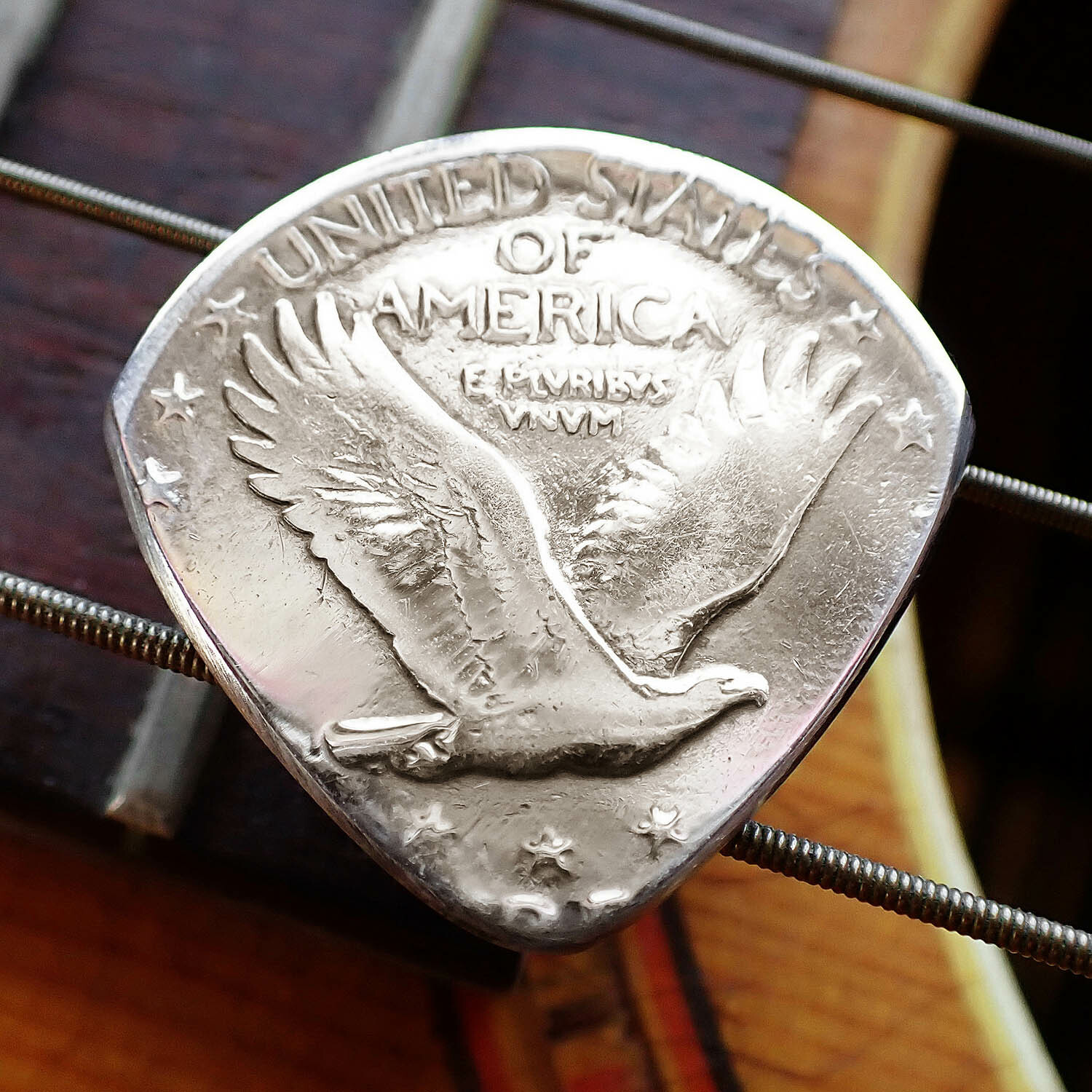 Note: This coin guitar pick has been handcrafted from authentic decommissioned American coinage and strictly adheres to 18 US Code § 331.