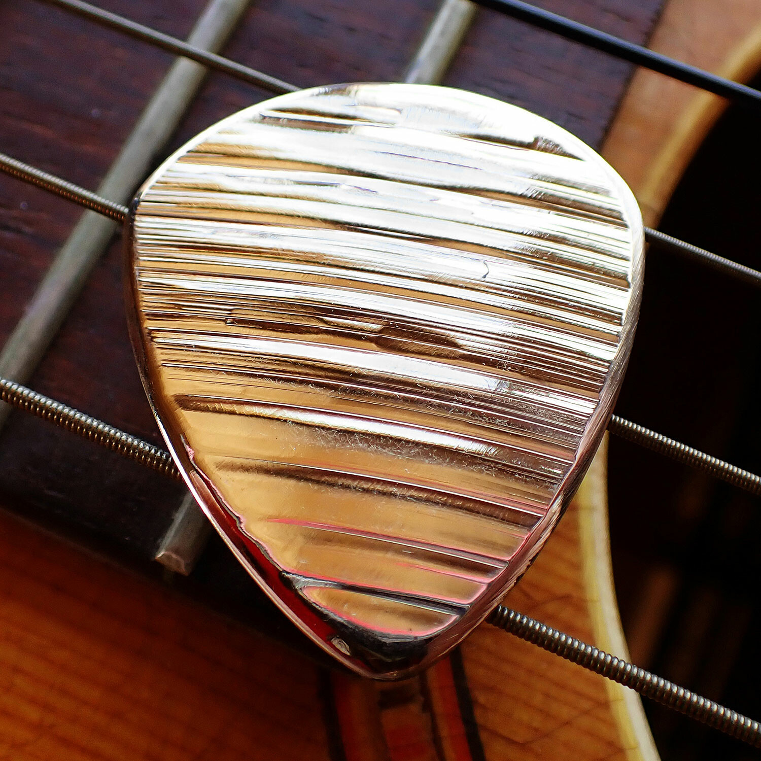 Handcrafted from contemporary Turkish drum cymbals by master picksmith Dustin Michael Headrick, this industrial bronze guitar pick features hand-lathed designs on the face and reverse, and a bright mirror polished gold color overall. The entire circumference of the pick edge is beveled liquid smooth for maximum performance and minimum string wear. The tonality is rich, bright, and harmonic, ultimately giving the instrument a completely new sound palette.