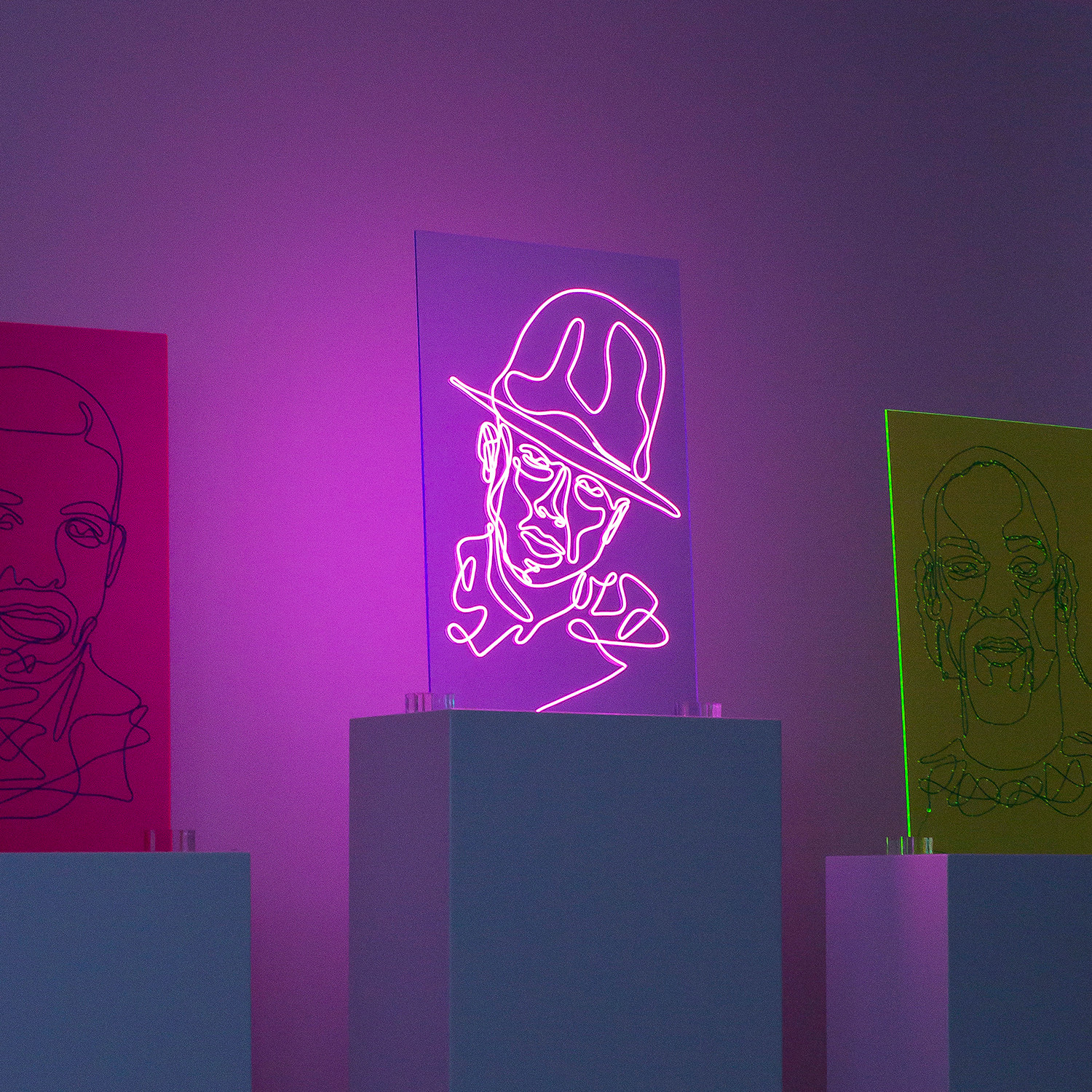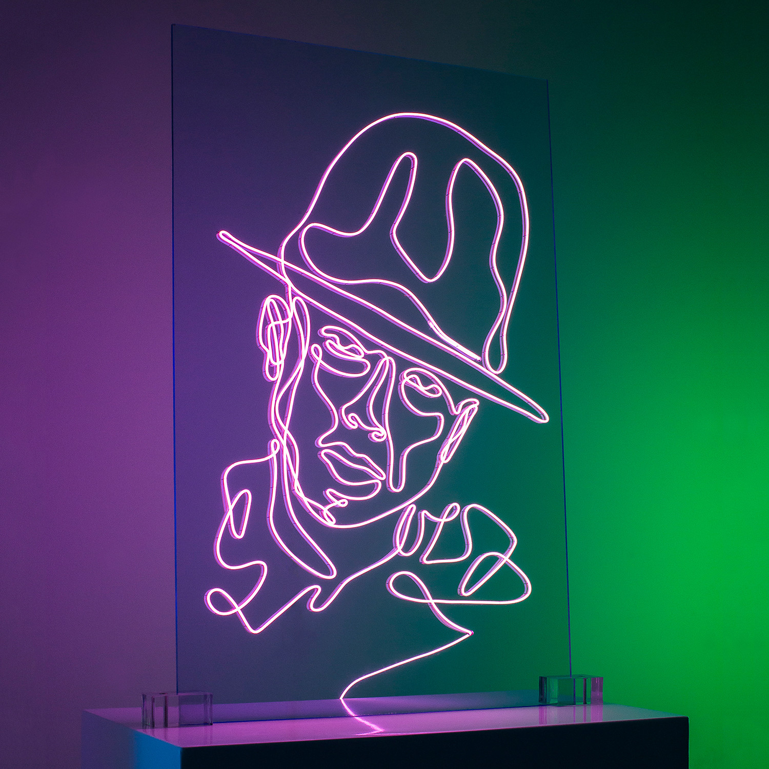 With a unique interest and approach to street culture and urban art, UK-born mixed media artist Natalie Wong, now based in Hong Kong, has earned global acclaim for her provocative work. Blue Pharrell is an original piece from her Neon Rap Portraits collection, recently exhibited in Hong Kong. For each work, Wong created a continuous line drawing of the iconic rapper, reflecting the fundamental technique of freestyle rapping. The drawings are then traced with electroluminescent wire mounted on acrylic.