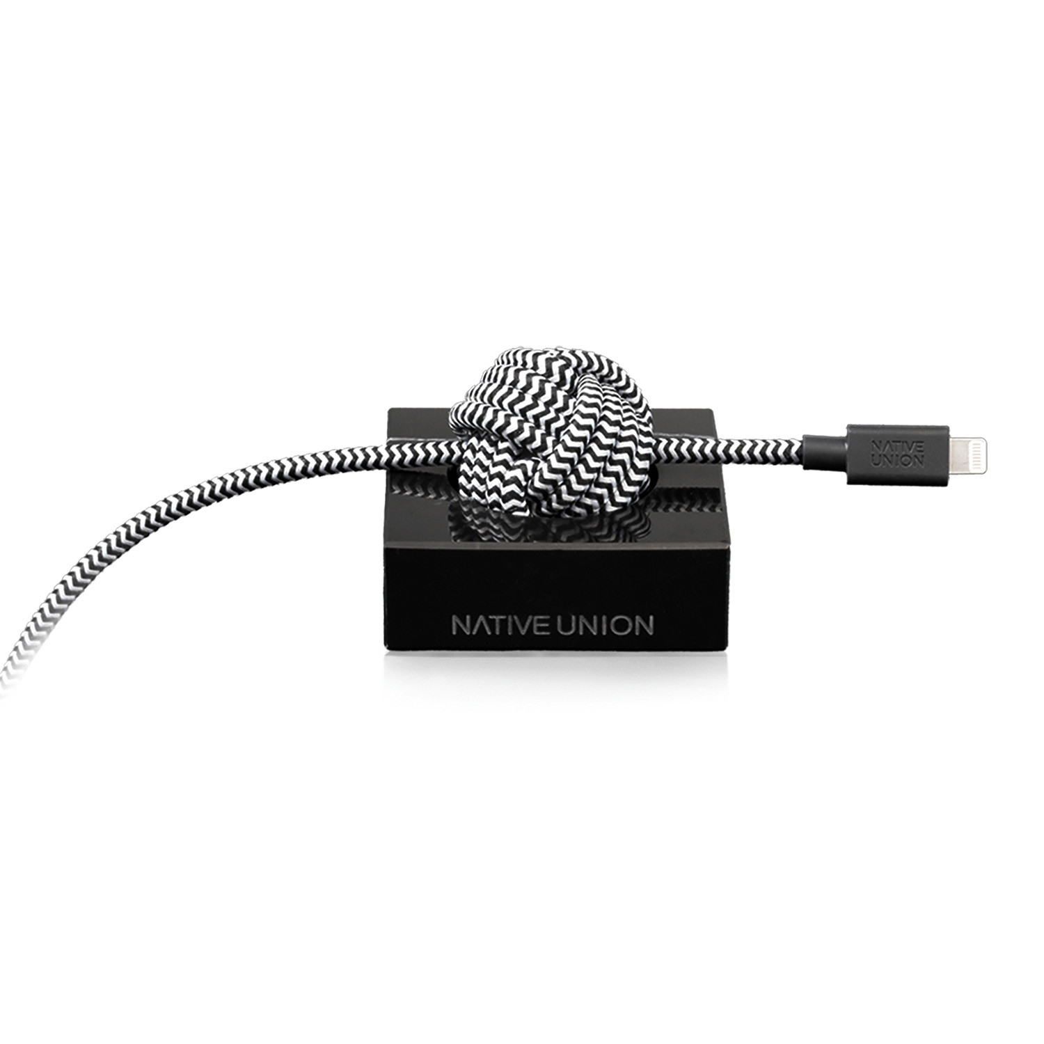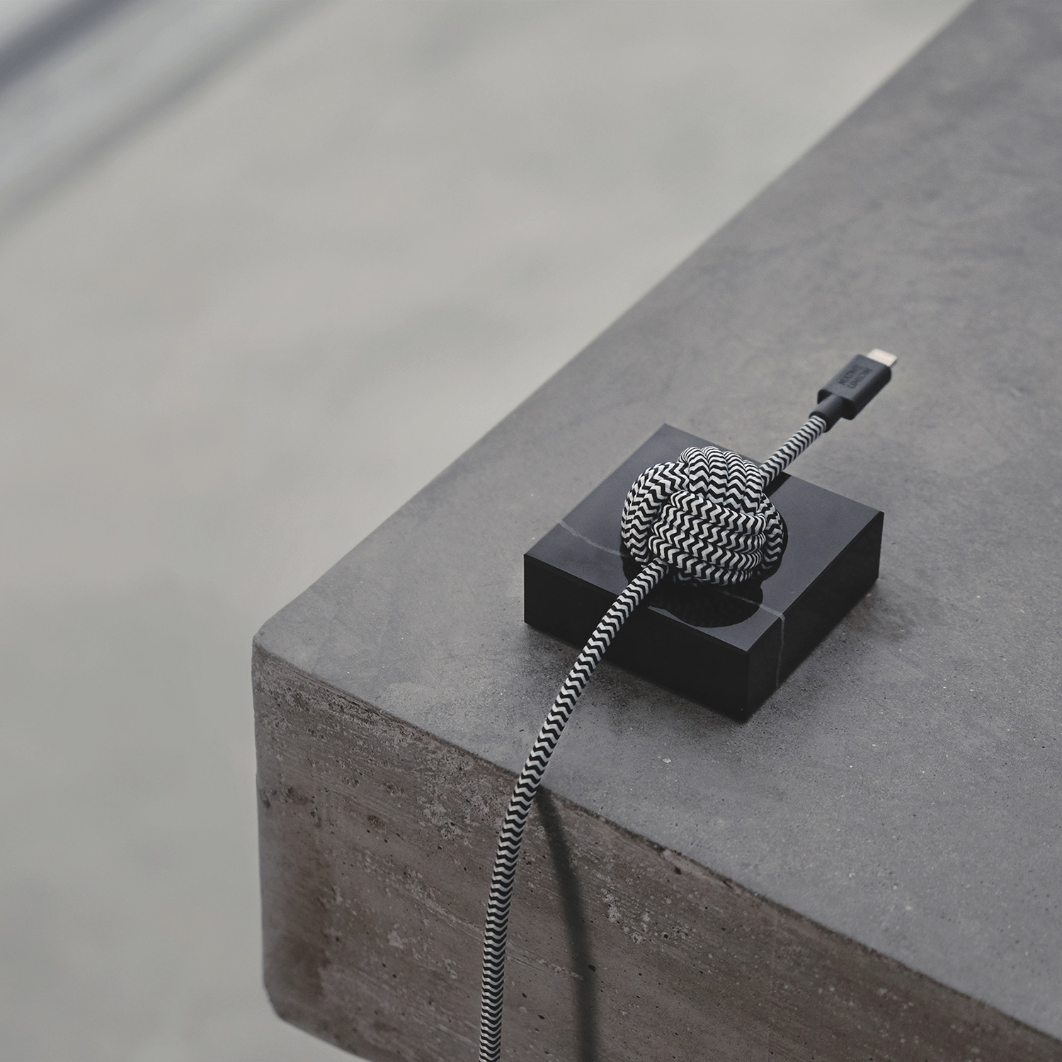 None of us enjoy fumbling around for dropped cables or straining to use our devices when they're recharging. Which is why the NIGHT Cable gives you a 10-foot range to comfortably charge anywhere. Its weighted knot can even be anchored to any flat surface, so it's there when you need it next. You can even change the position of the knot by sliding it along the cable. With a retro inspired aesthetic, it's built from crazy durable braided nylon that won't fray, fade, or tangle. This luxury version also includes a real marble base, to rest the knot on. Naturally heavy and polished by hand, the base makes a sophisticated addition to your desk or nightstand.