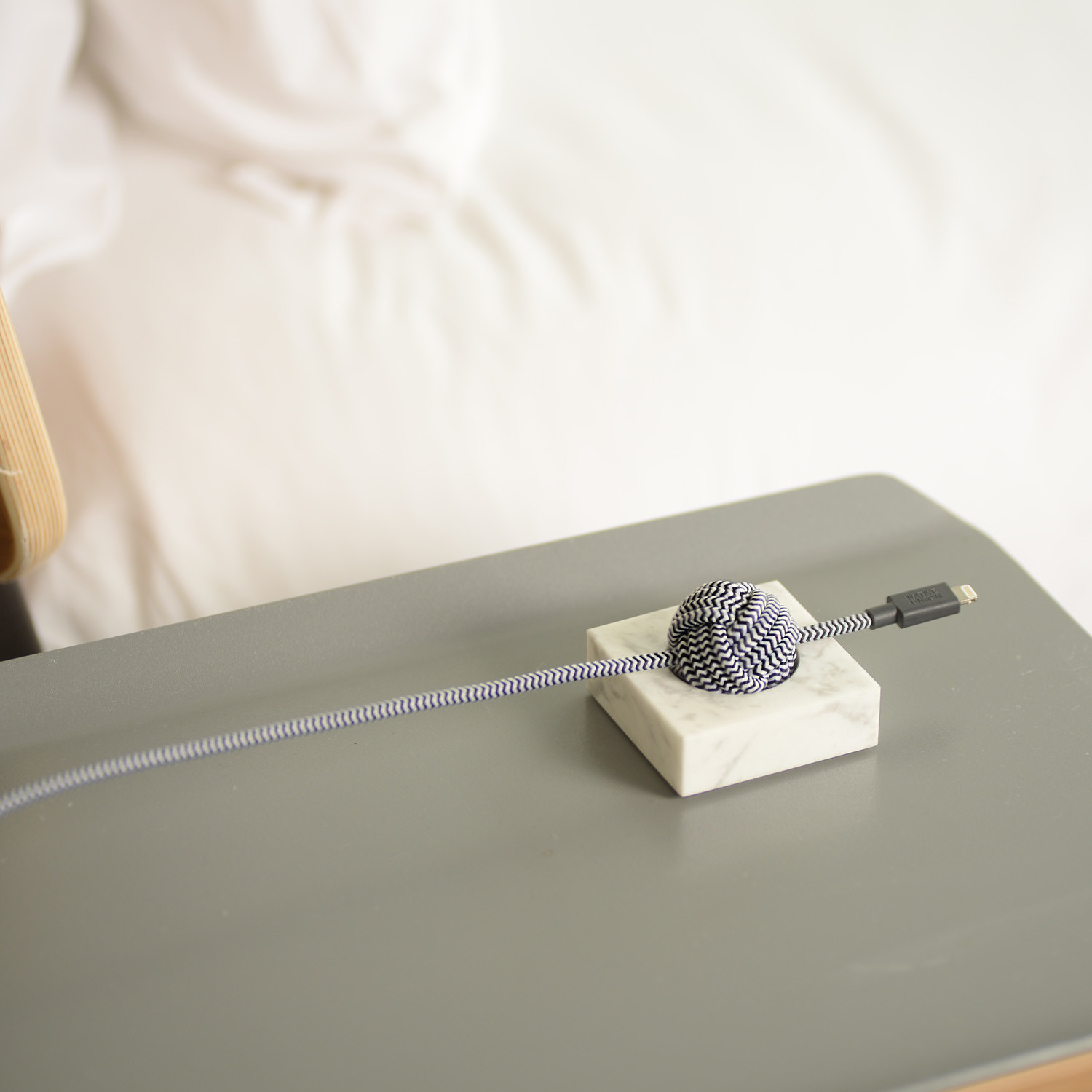 None of us enjoy fumbling around for dropped cables or straining to use our devices when they're recharging. Which is why the NIGHT Cable gives you a 10-foot range to comfortably charge anywhere. Its weighted knot can even be anchored to any flat surface, so it's there when you need it next. You can even change the position of the knot by sliding it along the cable. With a retro inspired aesthetic, it's built from crazy durable braided nylon that won't fray, fade, or tangle. This luxury version also includes a real marble base, to rest the knot on. Naturally heavy and polished by hand, the base makes a sophisticated addition to your desk or nightstand.