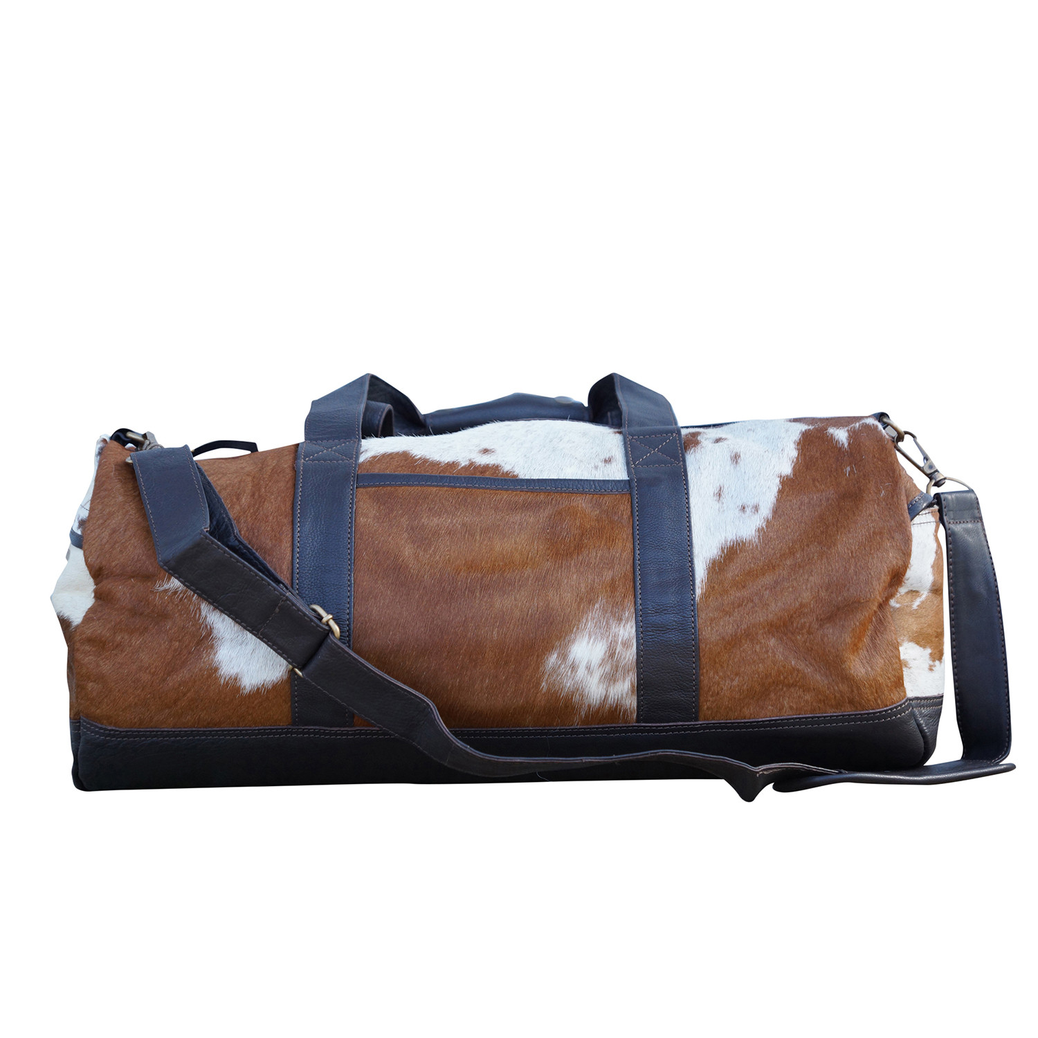 Even the most spontaneous travelers need the perfect weekender and it has arrived. This chic, cowhide bag is ready to jet at a moment's notice with a unique natural exterior, supple cotton lining, two inside pockets, one zippered pocket and a removable shoulder strap. Pack your bag and take to the road with this rugged style.