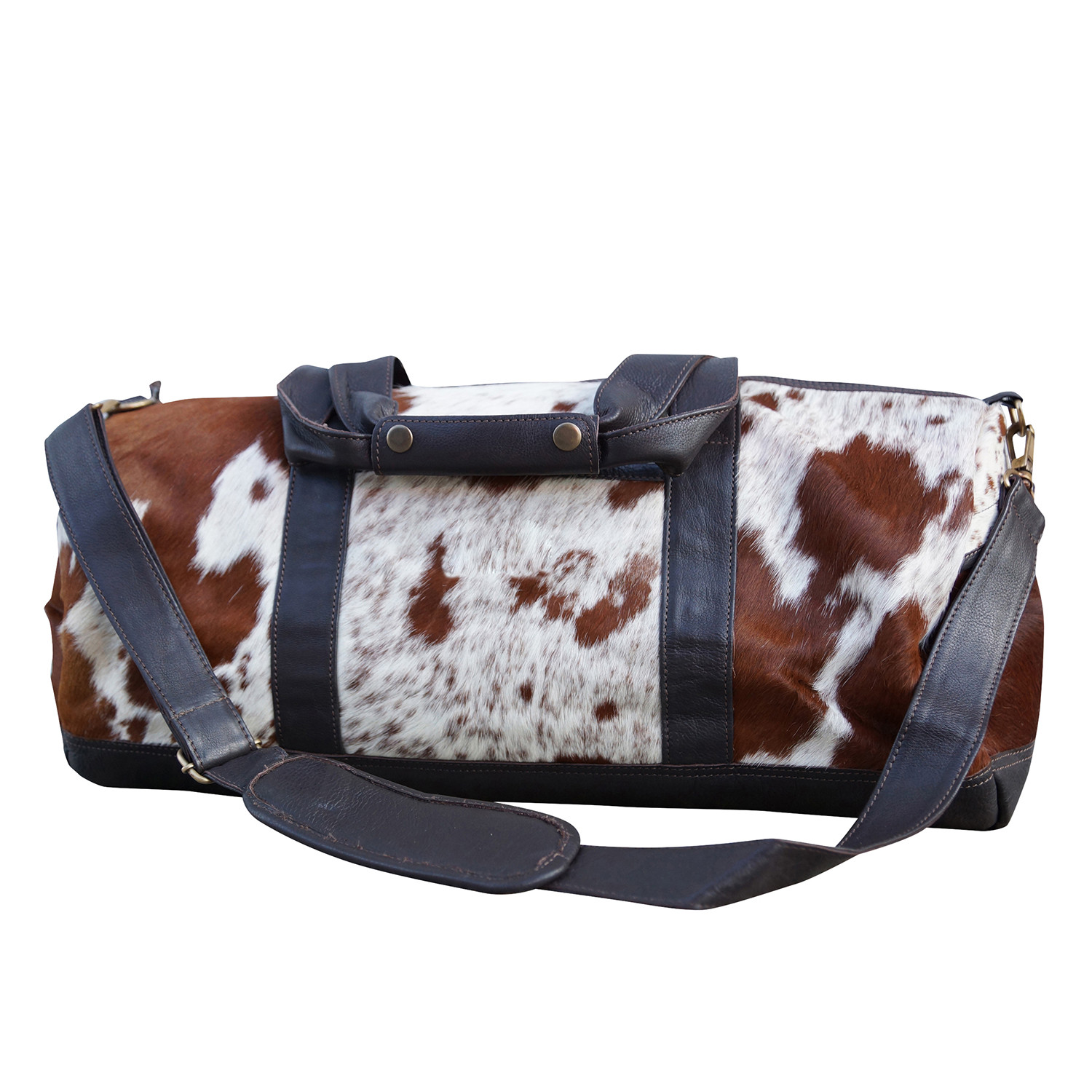 Even the most spontaneous travelers need the perfect weekender and it has arrived. This chic, cowhide bag is ready to jet at a moment's notice with a unique natural exterior, supple cotton lining, two inside pockets, one zippered pocket and a removable shoulder strap. Pack your bag and take to the road with this rugged style.