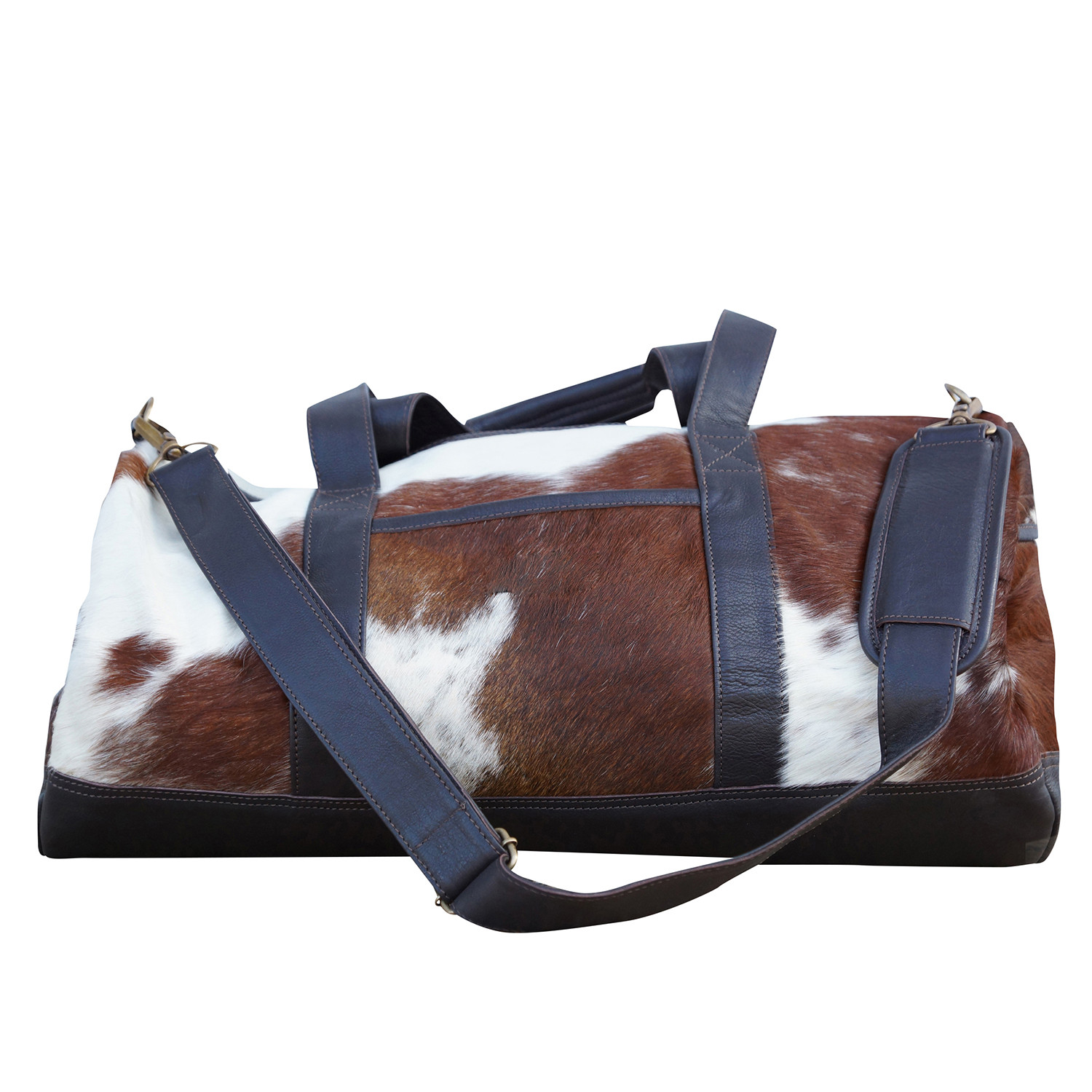 Even the most spontaneous travelers need the perfect weekender and it has arrived. This chic, cowhide bag is ready to jet at a moment's notice with a unique natural exterior, supple cotton lining, two inside pockets, one zippered pocket and a removable shoulder strap. Pack your bag and take to the road with this rugged style.