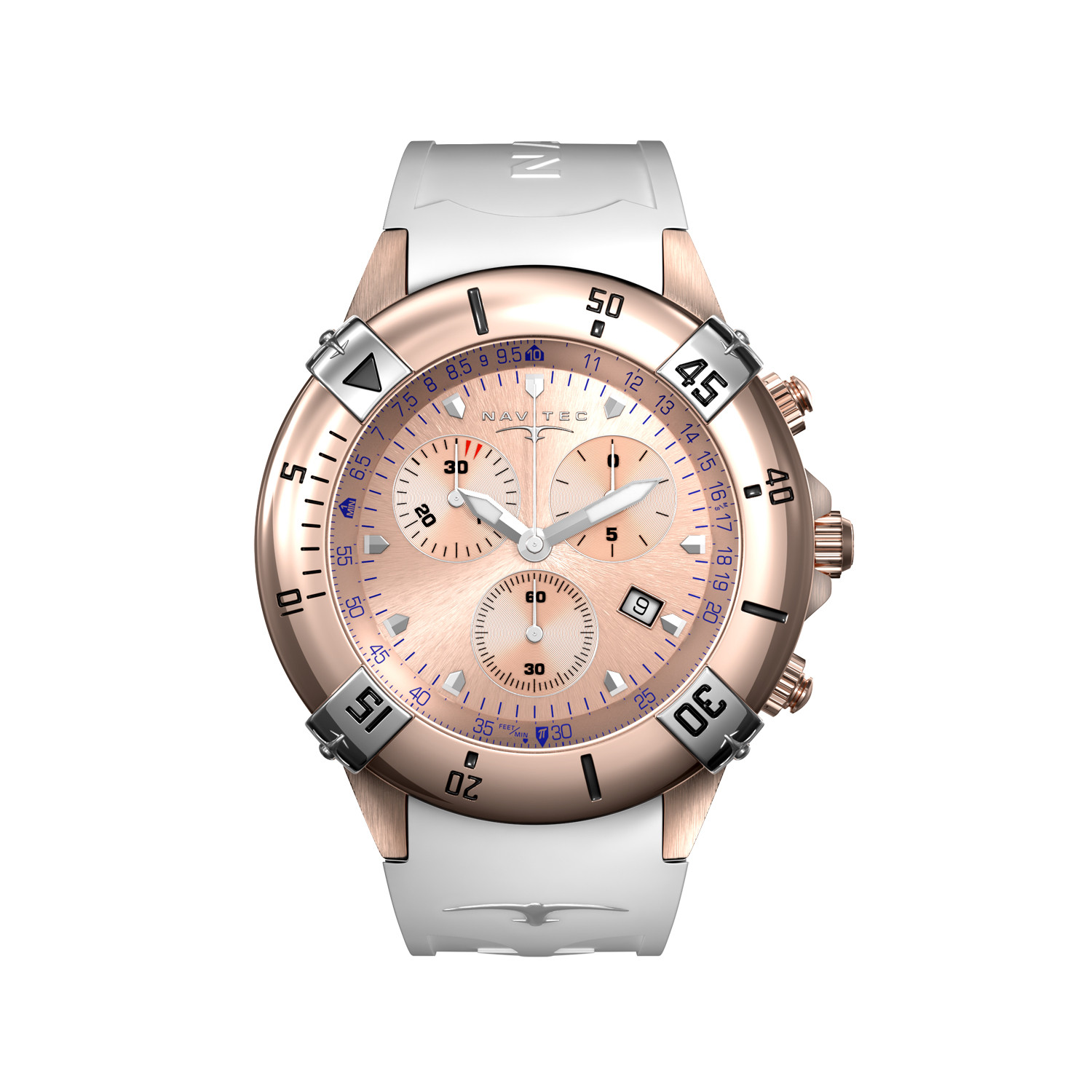 The Tango Charlie is a prime example of Navitec's legecy as the only Swiss-made chronographs equipped with interchangeable bezel systems engineered specifically for navigation. In addition to its luxury outfitting, it boasts a multitude of unique functions. This mini aviation wonder can also convert measurements, calculate speed, quick correct the date, and more. It's the ultimate timepiece for the navigation and function-obsessed.