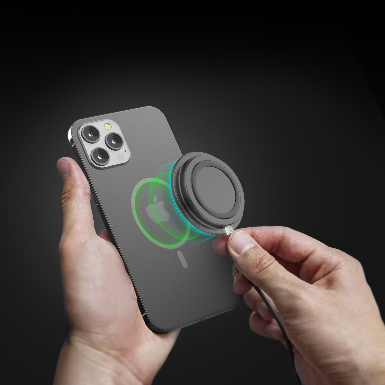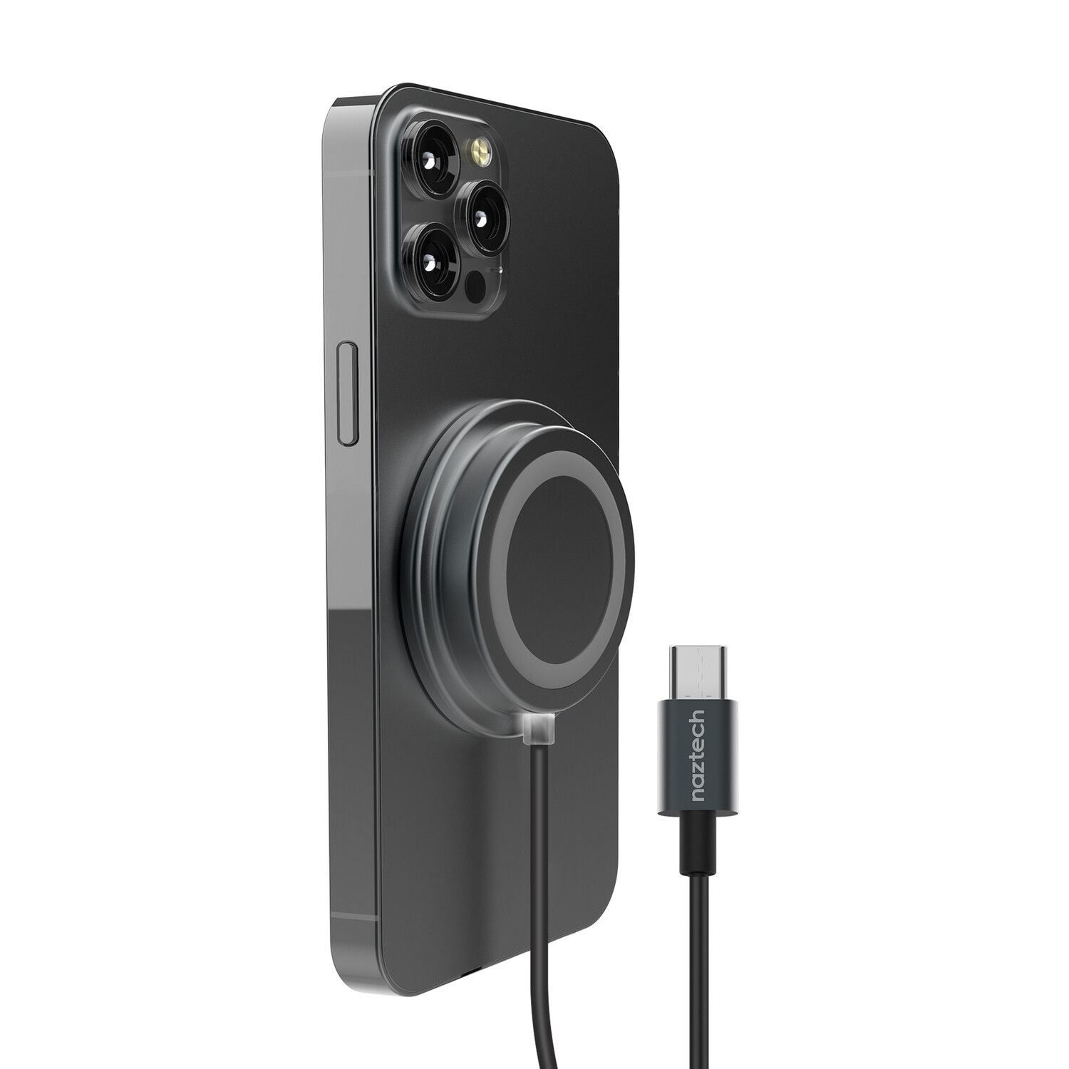 Naztech's alloy charger makes fast wireless charging a snap! Perfectly aligned magnets effortlessly attach to the back of your iPhone 14 or Magsafe case and deliver up to 15W of wireless power. With 3x the power of standard wireless and wired chargers, this magnetic charger is engineered to get your device back to full charge faster than ever. Powerful and secure magnets keep the charger in place, allowing for continued phone use as you charge.
