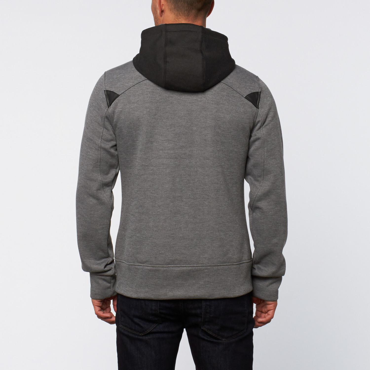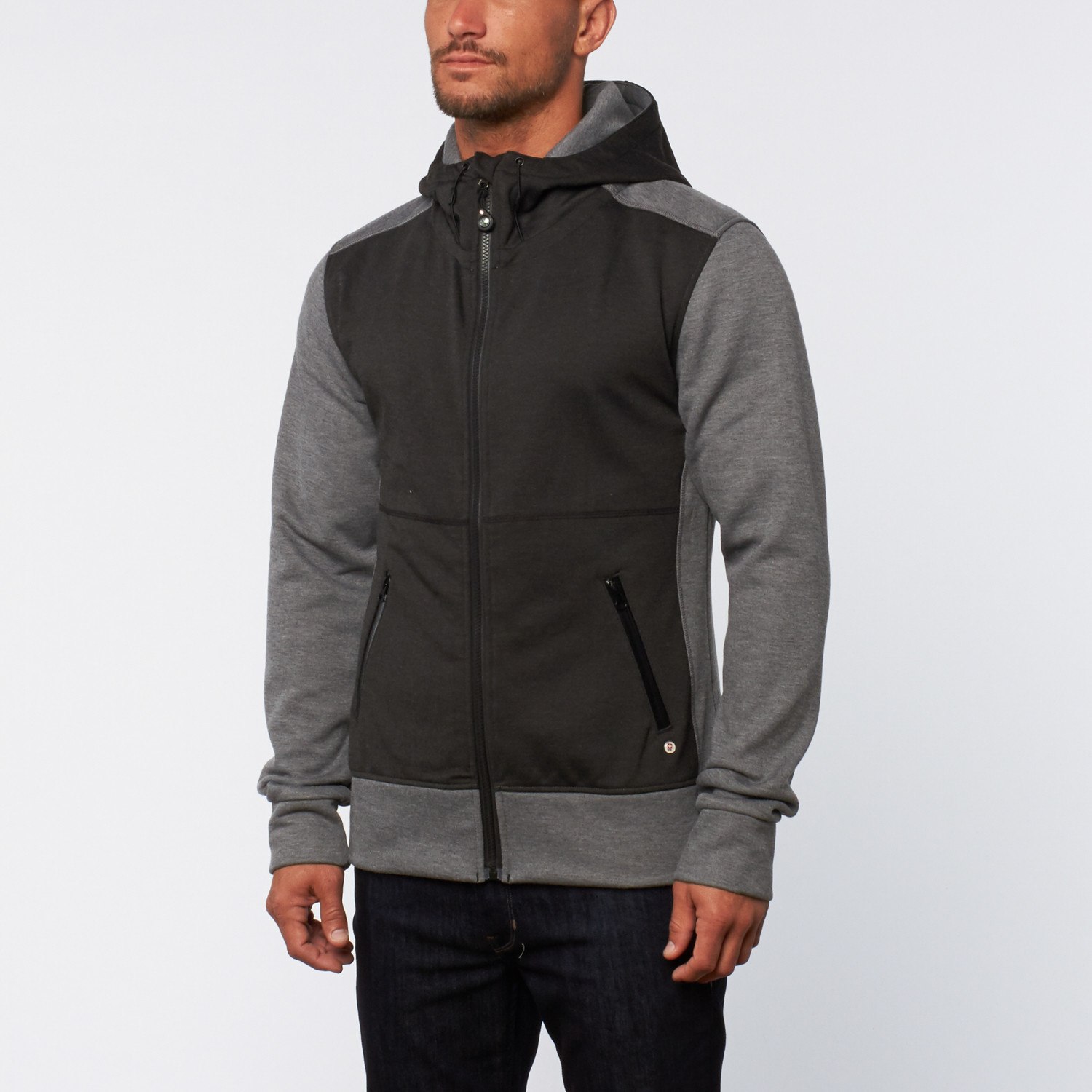The Stretch Hooded Jacket combines sporty elements with a street style bent. Done in a custom stretch fabric blend, it features a combination stand collar and hood for added edge.