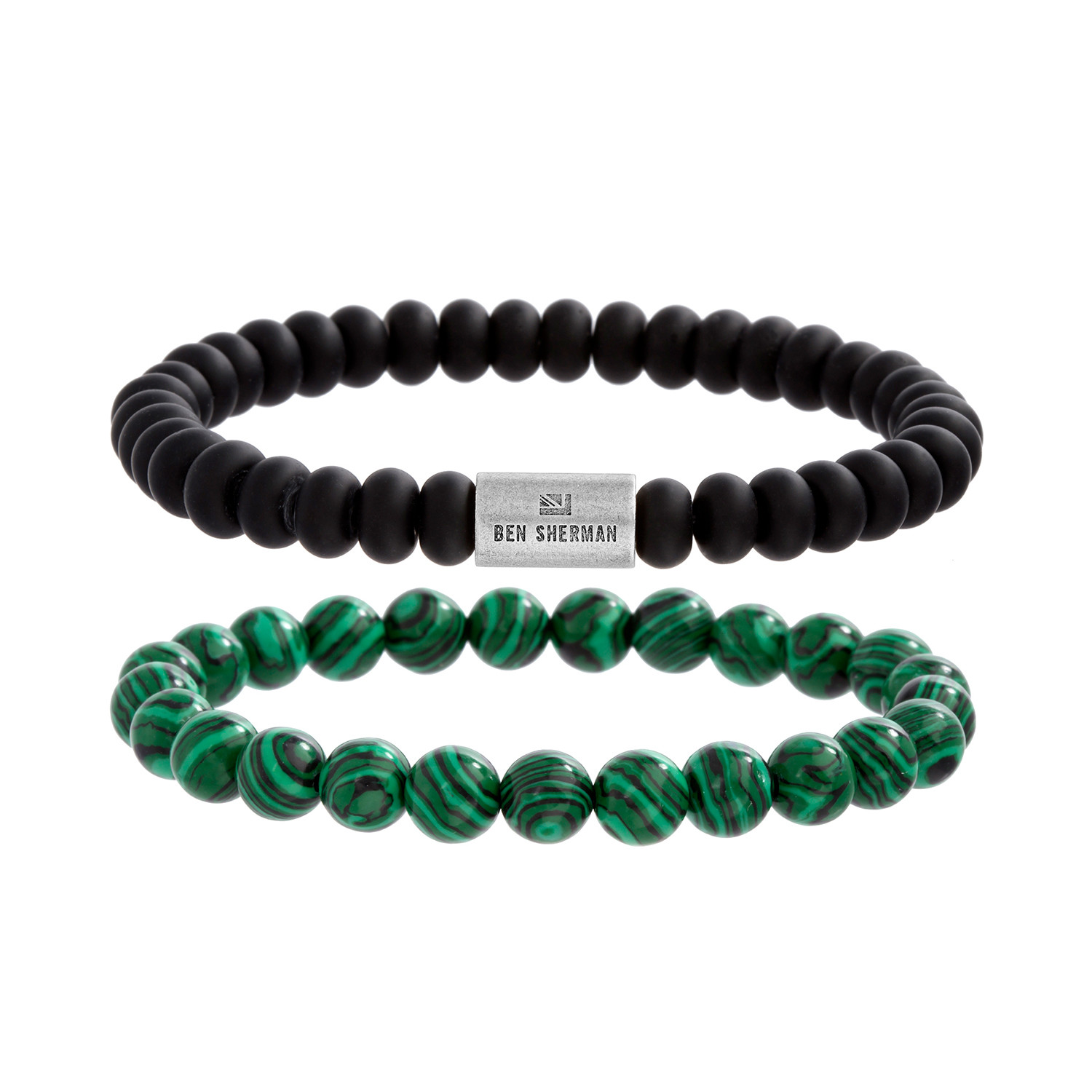 Cylindrical Bar Beaded Stretch Duo Bracelet Set // Black + Green