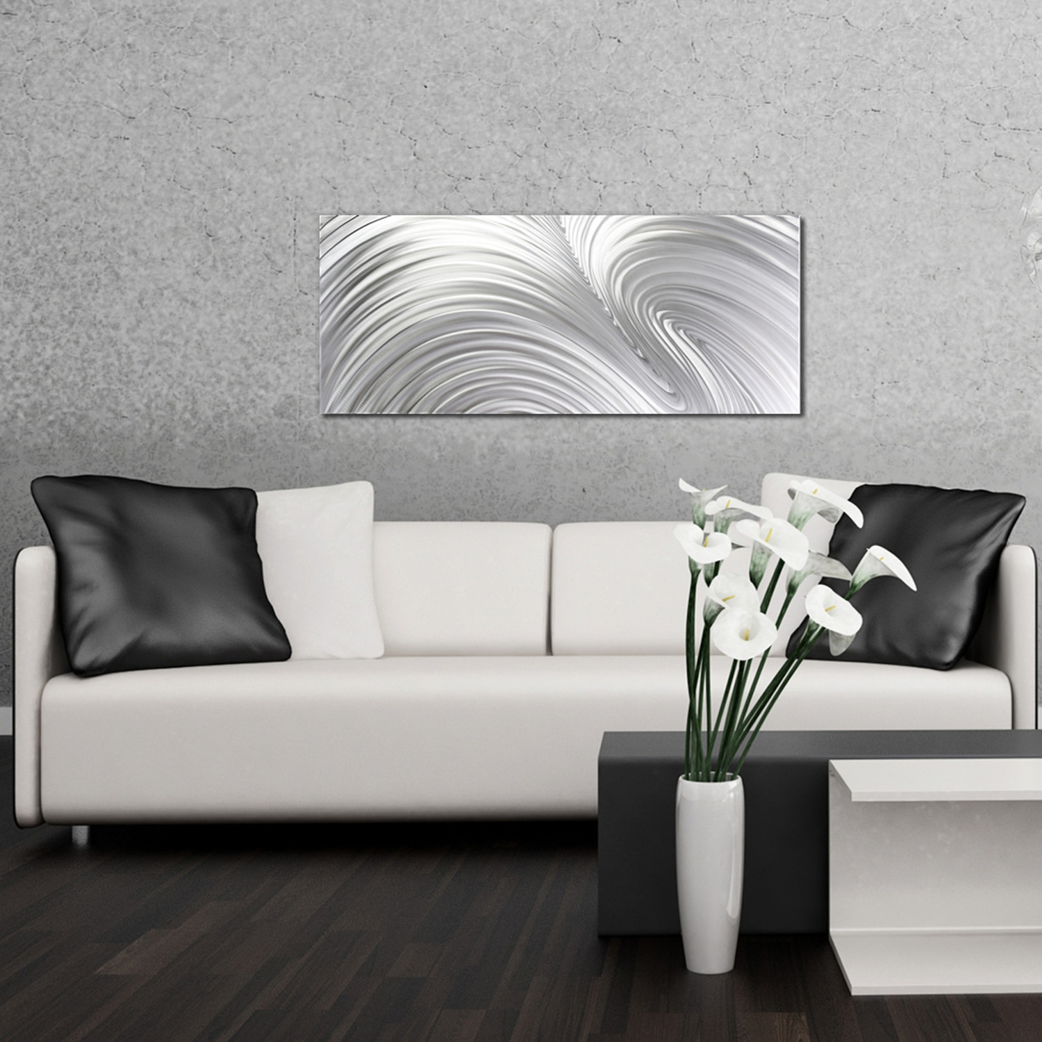 Fusion is one of Nicholas Yust's most celebrated metal creations. The smooth, arching grind pattern that graces the surface has quickly become one of his trademarks. The key to the consistent sweeping pattern across the surface of the metal is his solitary positioning: the artist must keep his feet planted at the center of the panel and grind from one side to the other without taking a step. This ensures a smooth pattern without imperfections — even the slightest motion with his feet will affect the angle and arc of the grind pattern, causing a bump or a hiccup in the otherwise flawless metallic finish. Something that Nicholas, being a perfectionist with his artwork, will not tolerate...
