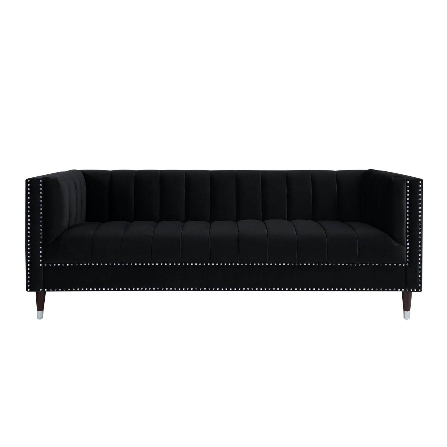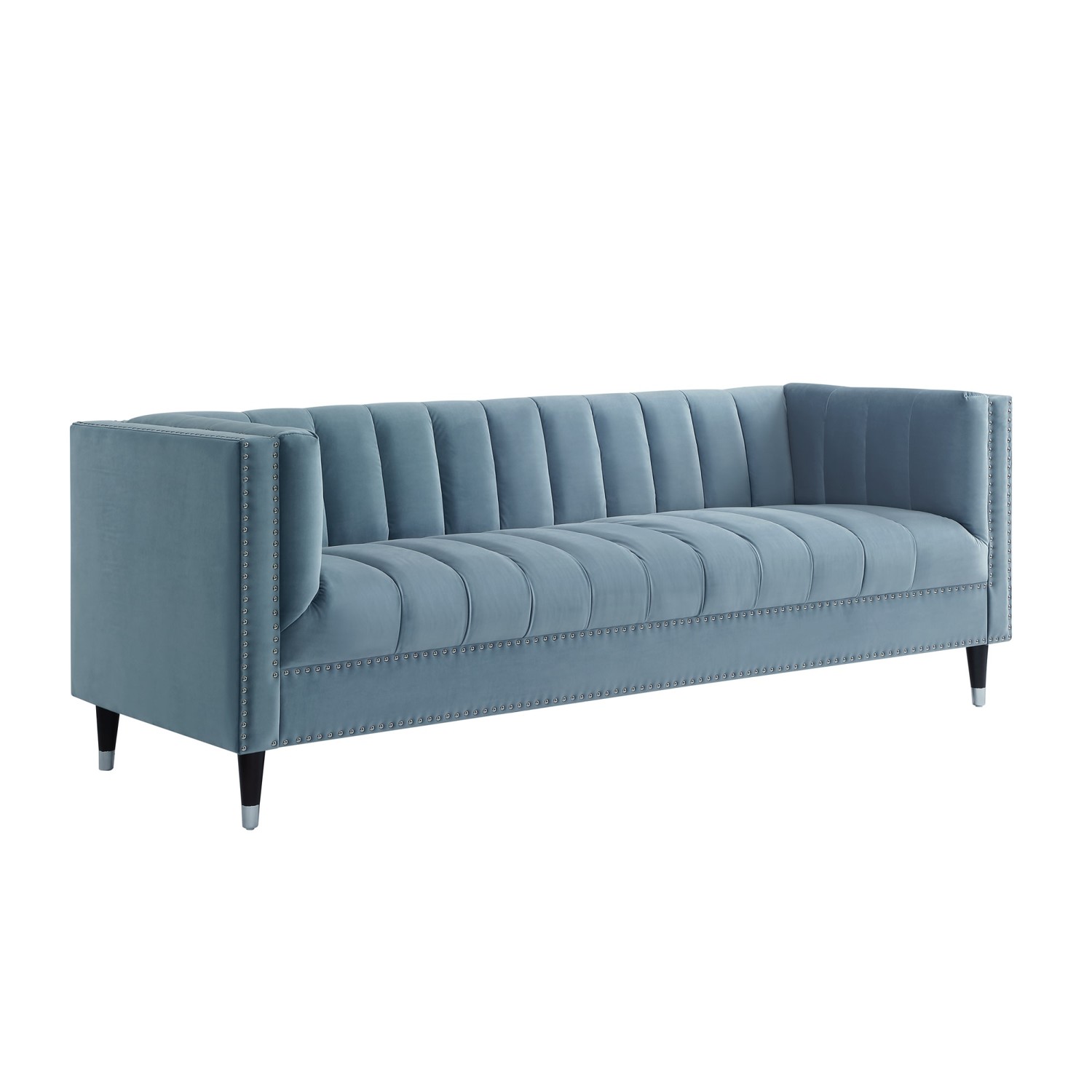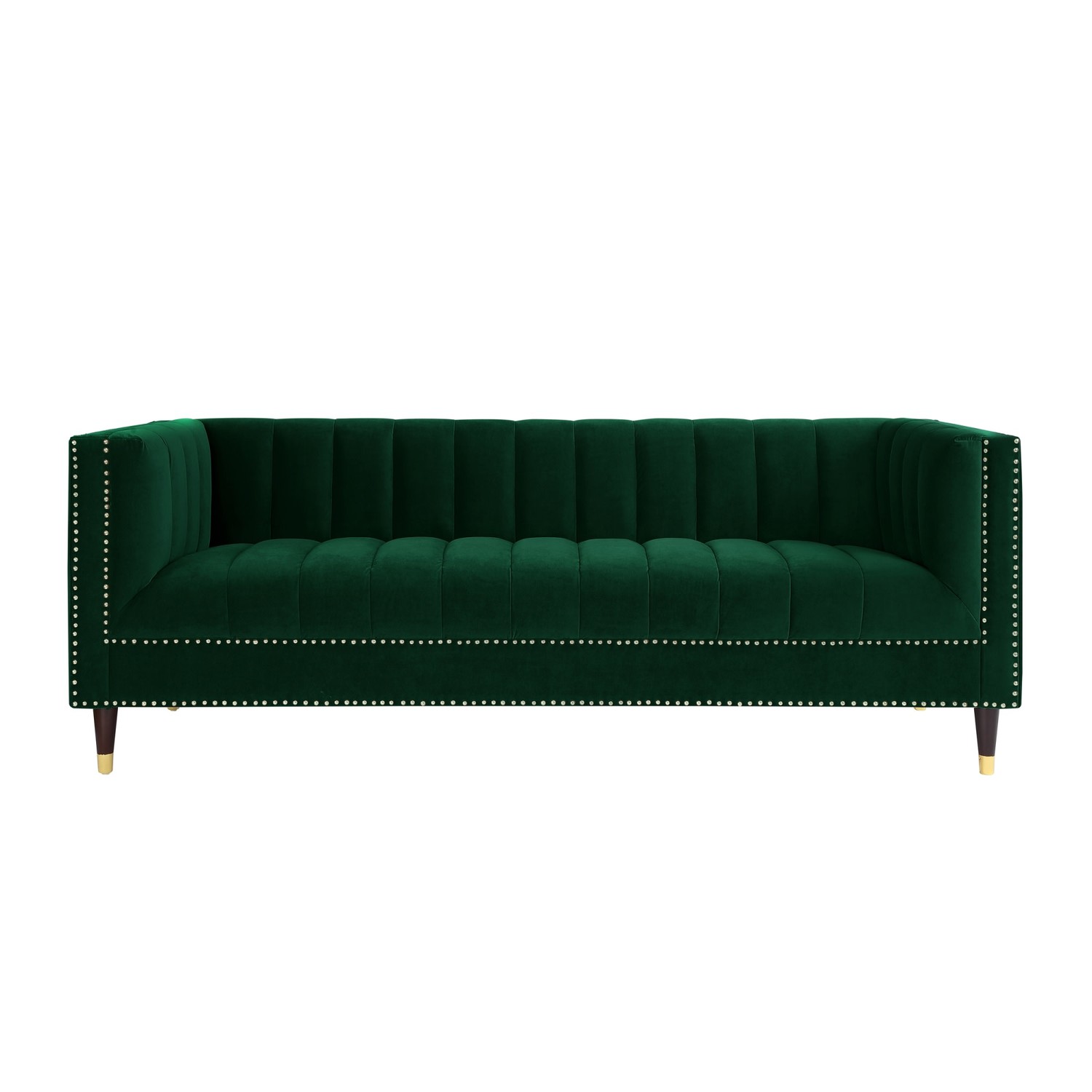 The comfortable and elegant Geoffey velvet sofa allows you to perch upright and take part in a meeting or to relax with a laptop or mobile device. Crafted with line stitch tufts all along the back, seat, and inner arms, this sofa brings class and comfort to your home or office.