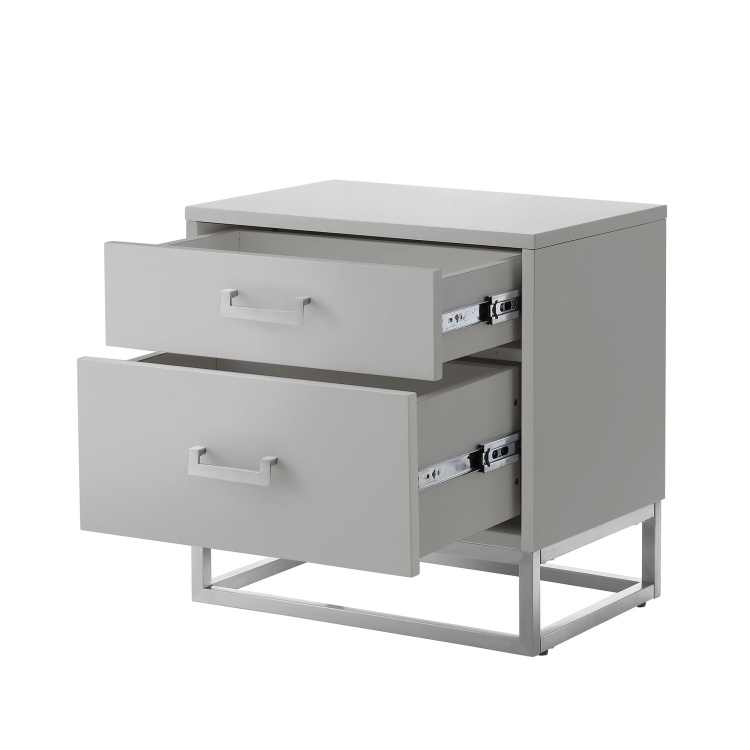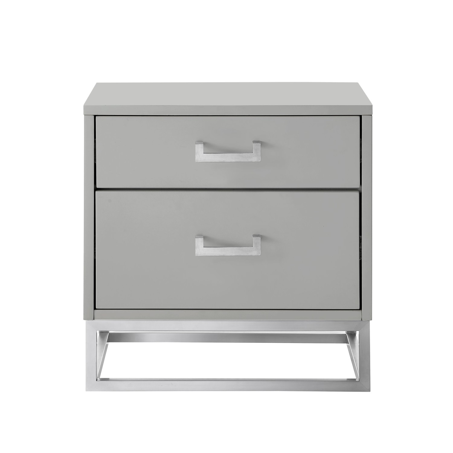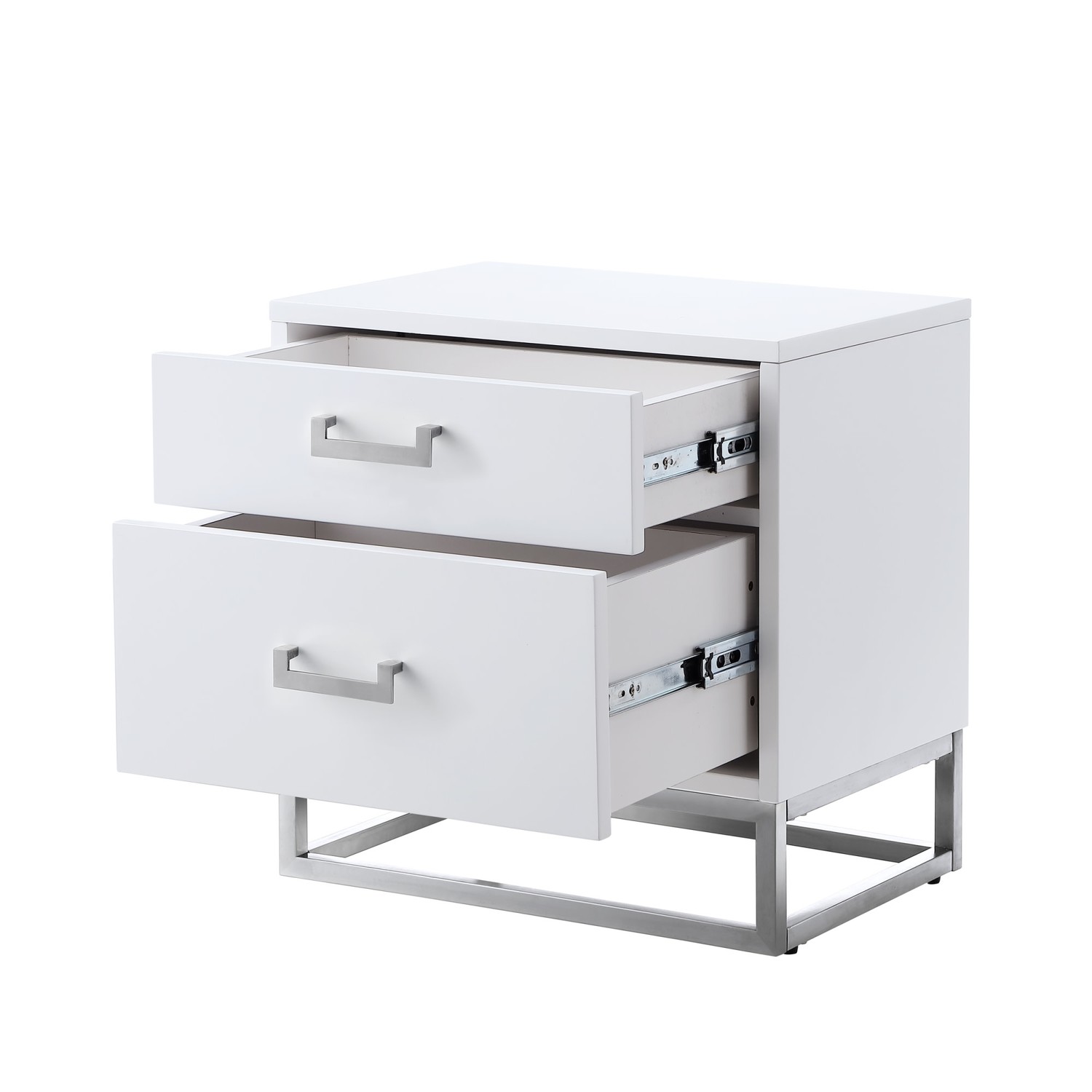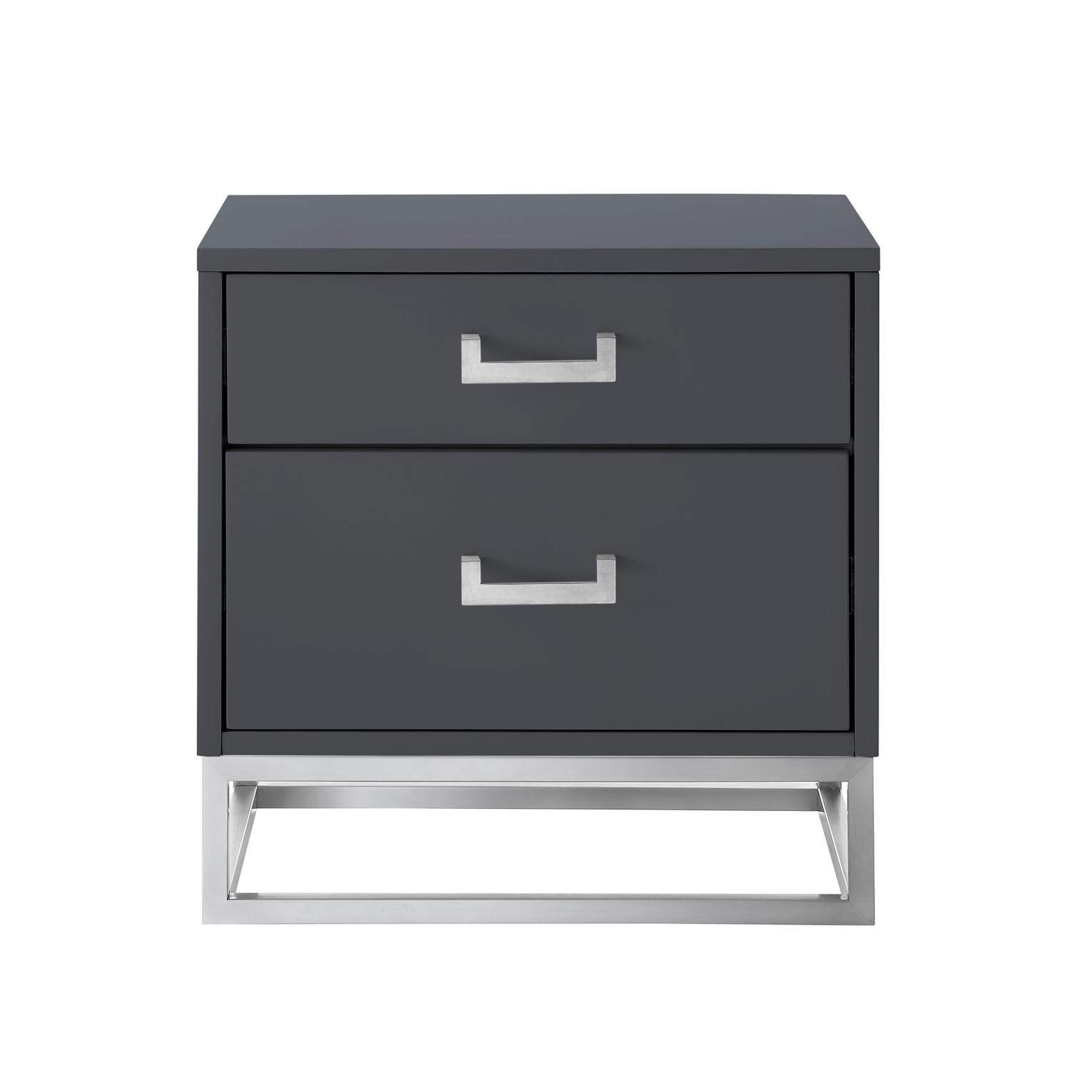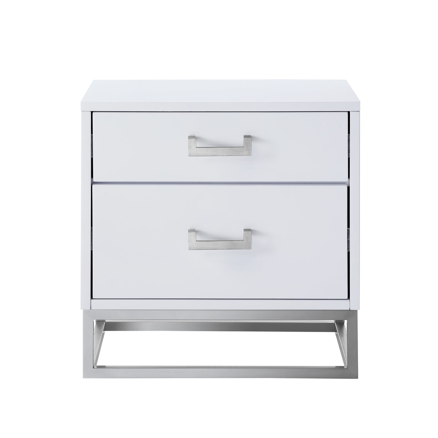 The Perkolli side table adds gentle sophistication to your bedroom, living room, or office. Crafted from MDF in a sleek high gloss finish, this elegant two drawer piece is ideal as an end table in your living room or a nightstand in your bedroom. Shiny handles is a perfect complement to stainless steel base that provides a focal point of color and style.